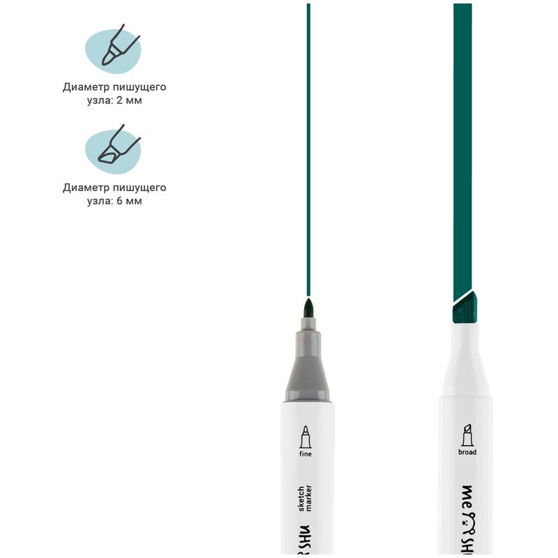 - Маркеры обладают пулевидным (2 мм) и скошенным (6 мм) наконечниками, что позволяет прорабатывать как мелкие детали рисунка, так и закрашивать большие области.
