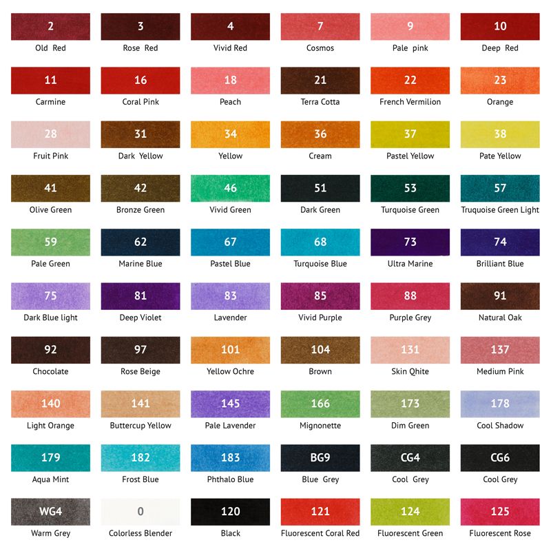 В наборе 60 основных цветов. Маркеры подходят для создания аниме и манги. Маркеры обладают пулевидным (2мм) и скошенным (6 мм) наконечниками, что позволяет прорабатывать как мелкие детали рисунка, так и закрашивать большие области. Толщина линии может варьироваться от 1 до 6 мм. Длина письма может достигать до 350 метров.