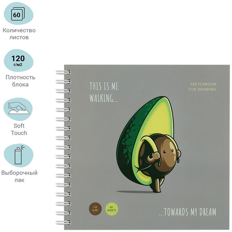 Благодаря компактному формату скетчбук удобно брать в путешествие, на прогулку или пленэр. Переплёт на гребне позволяет раскрывать изделие на 360 градусов. Скетчбук легко перелистывать и открывать в нужном месте. Изделие превращается в планшет — формат, который подходит для рисования на коленке. В обложке используются приятное на ощупь покрытие soft-touch и выборочный лак. Скетчбук с изображением забавного авокадо поможет найти вдохновение. Изделия поставляются в индивидуальных пакетах.