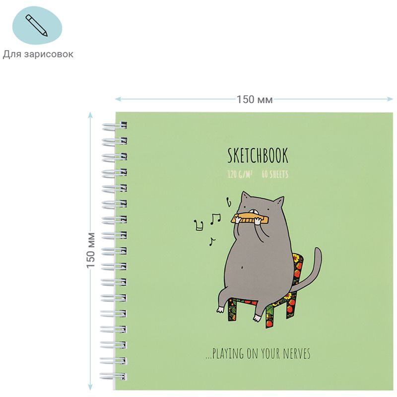 Изделие размером 150 x 150 мм подойдёт для рисования цветными и акварельными карандашами, а также другими графическими материалами. Внутренний блок — 60 белых листов из офсетной бумаги плотностью 120 г/м2.