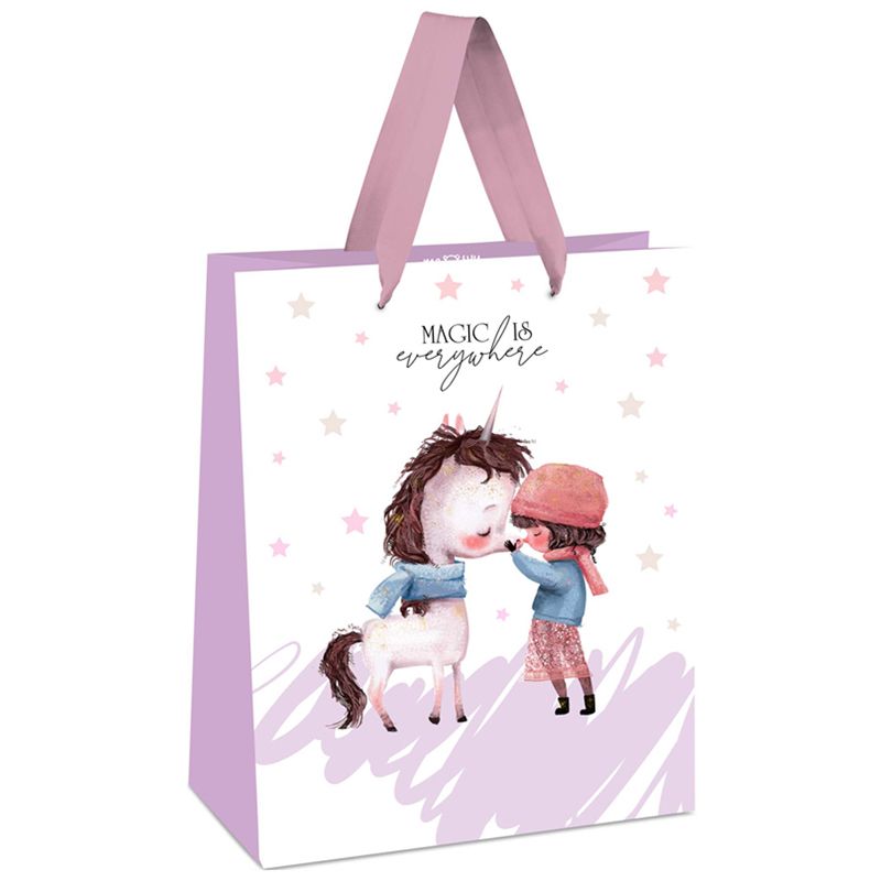 Размер подарочного пакета – 11*14*6,5 см. Изготовлен из белой крафт-бумаги с отделкой фольгой. Пакет MESHU Magic is everywhere выполнен в нежном и милом дизайне.
