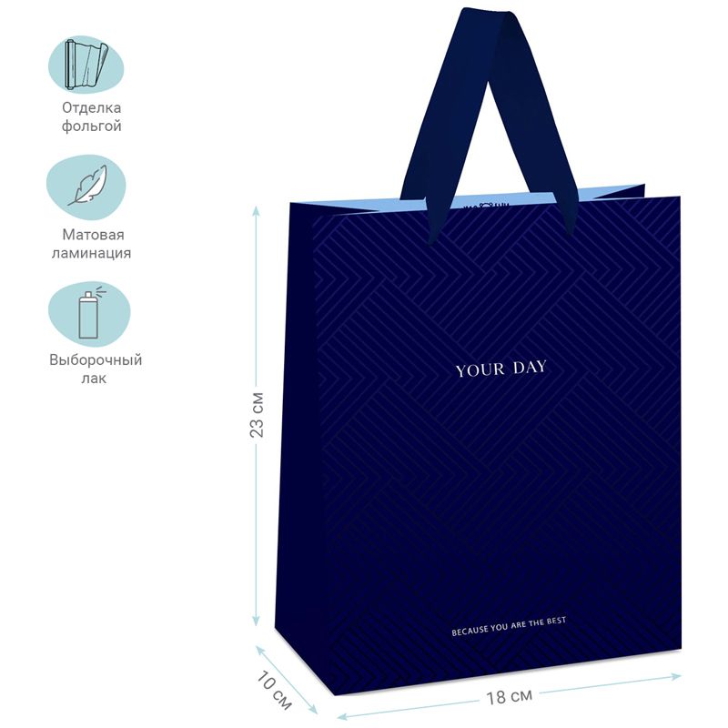Размер подарочного пакета – 18*23*10 см. Изготовлен из плотного мелованного картона с выборочным лакированием, матовой ламинацией и отделкой фольгой. Пакет MESHU Indigo Hills выполнен в минималистичном ярком дизайне.