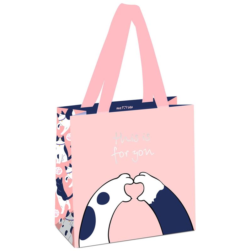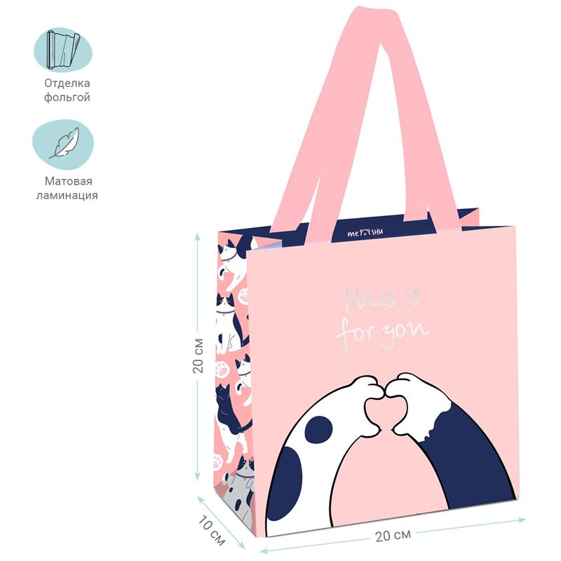 Размер подарочного пакета – 20*20*10 см. Изготовлен из плотного мелованного картона с матовой ламинацией и отделкой фольгой. Пакет MESHU This is for you выполнен в милом дизайне.
