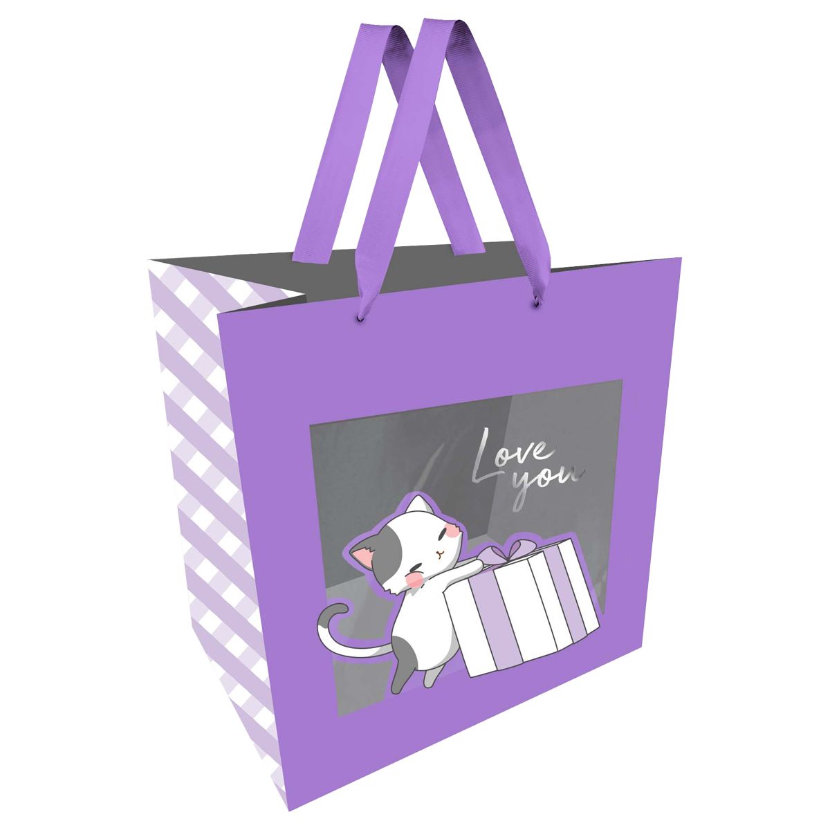 Размер подарочного пакета – 23*18*10 см. Изготовлен из плотного мелованного картона с отделкой фольгой и окошком.