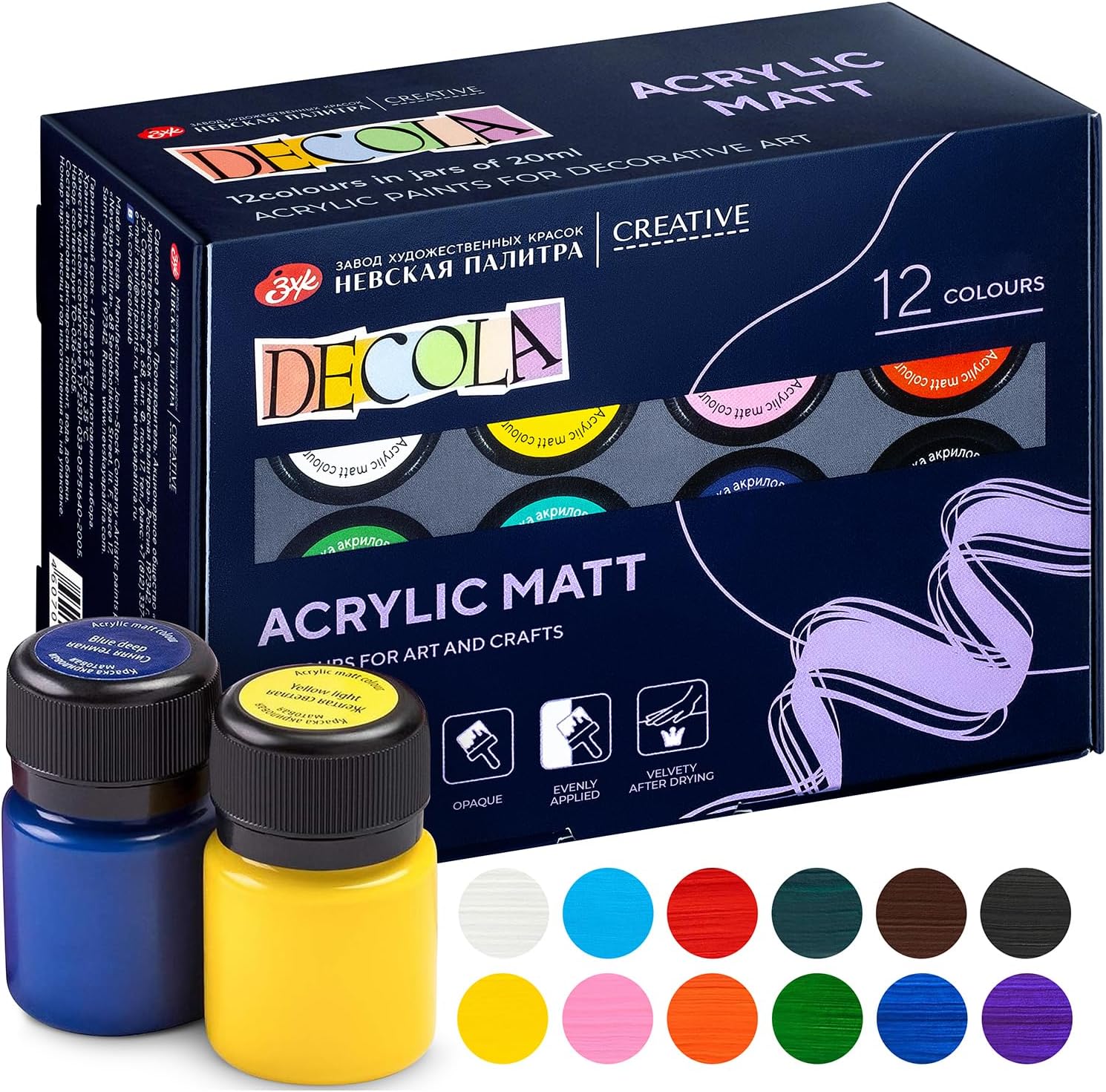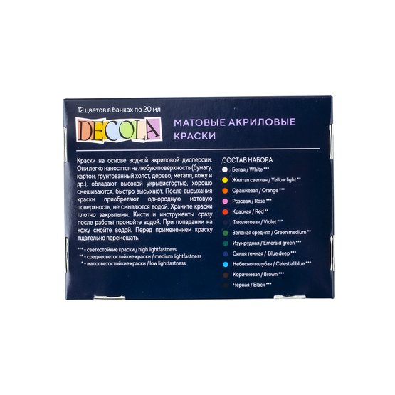 <strong>Набор акриловых красок «DECOLA»</strong> включает 12 баночек по 20 мл воднодисперсных, быстро сохнущих акриловых красок разных цветов. Эти краски можно разбавлять водой, но после высыхания они становятся водостойкими.