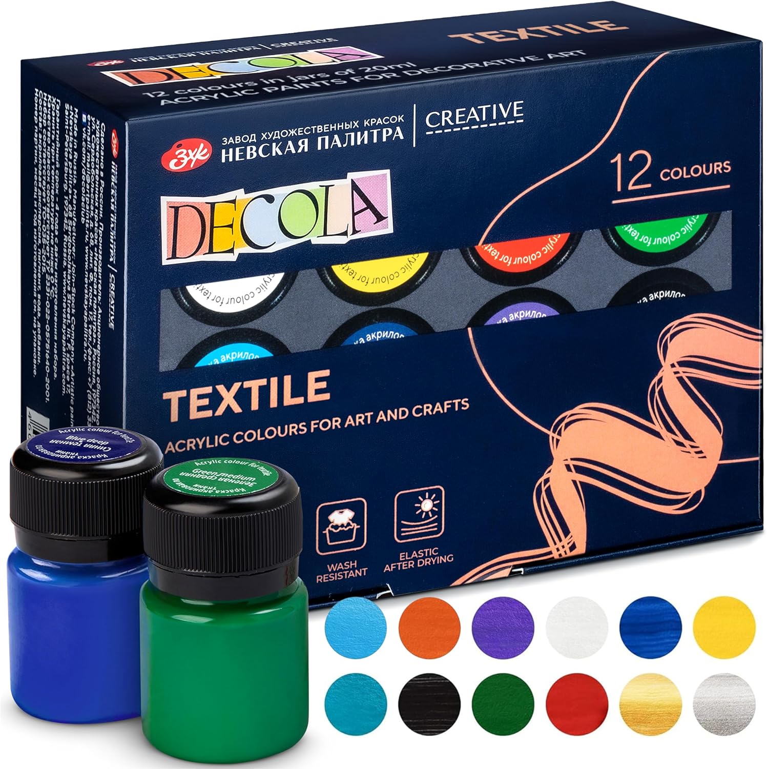 Акриловые краски по ткани Decola изготавливаются на основе водной акриловой дисперсии и образуют после высыхания прочную эластичную пленку на поверхности. Краски предназначены для росписи хлопчатобумажных и шелковых тканей.<br>