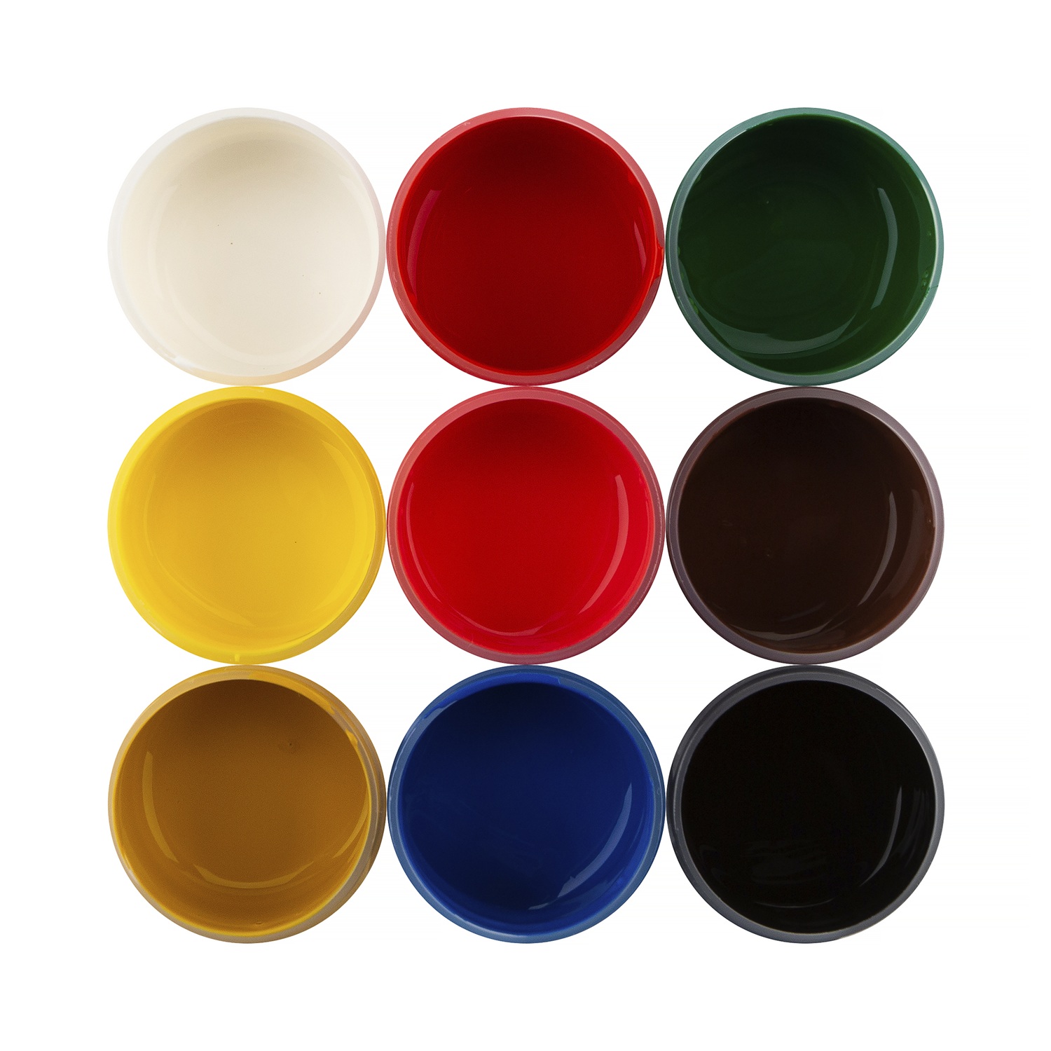 <li>Белая, желтая, охра, красная, розовая, синяя, зеленая тёмная, коричневая, черная.</li>