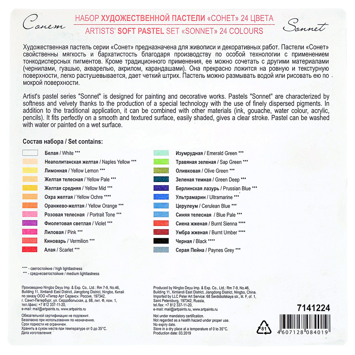 <p>Сухая мягкая пастель «Сонет» в наборе из 24 цветов — это оптимальный выбор для тех, кому базового набора уже недостаточно, а 48 оттенков кажутся избыточными. Благодаря тонкодисперсным пигментам пастель обладает характерным мягким и бархатистым штрихом. Она идеально ложится на фактурную бумагу и легко растушевывается пальцами или специальными инструментами, позволяя создавать глубокие тоновые переходы и сложные живописные эффекты.</p>