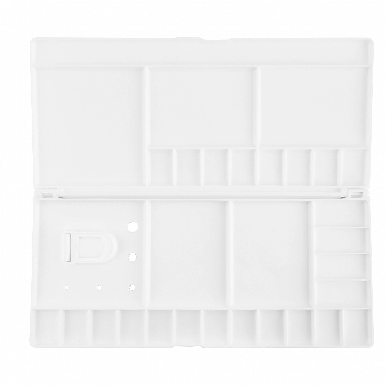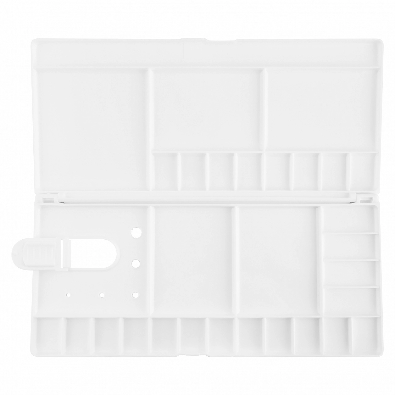 Для удобной работы на весу палитра снабжена открывающимся отверстием для пальца и тремя отверстиями для кистей.<br>