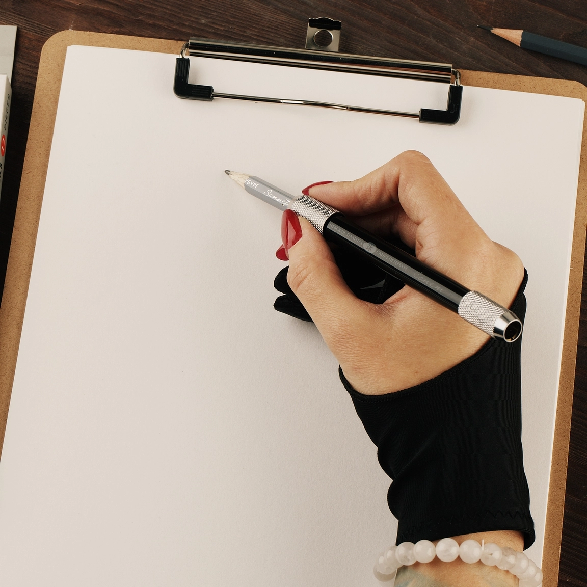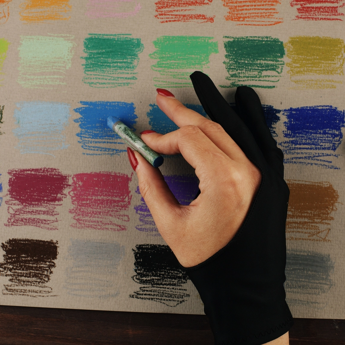 Незаменимый аксессуар художника при работе с графическими материалами (например, карандашами, углём, пастелью, маркерами): перчатка защищает руку от пыли, грязи и повреждений во процессе работы, уменьшает трение между рукой и поверхностью рисунка, не позволяя руке воздействовать на поверхность.<br>