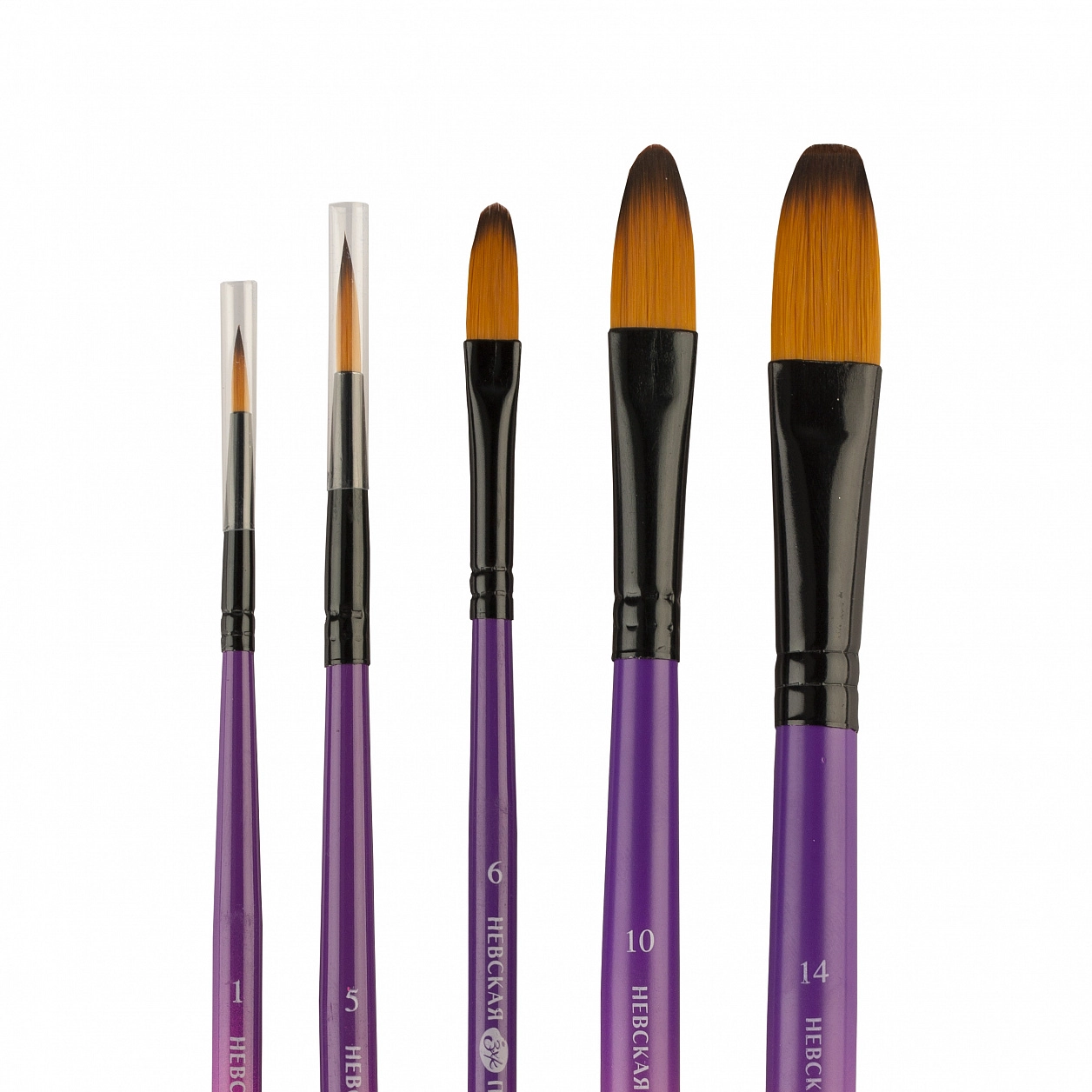 <strong>Кисти в наборе:</strong> № 1, 5 — круглые; № 6, 10, 14 — овальные.