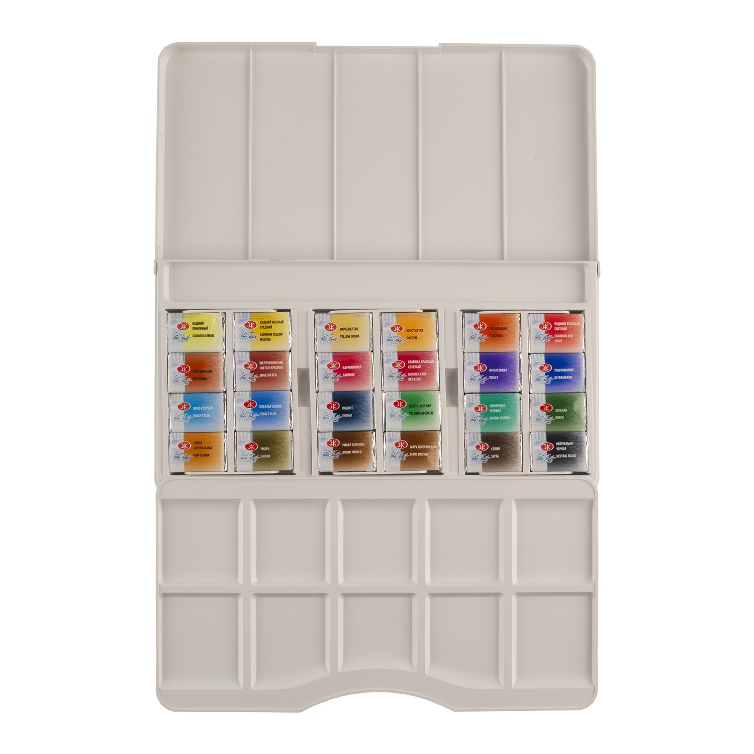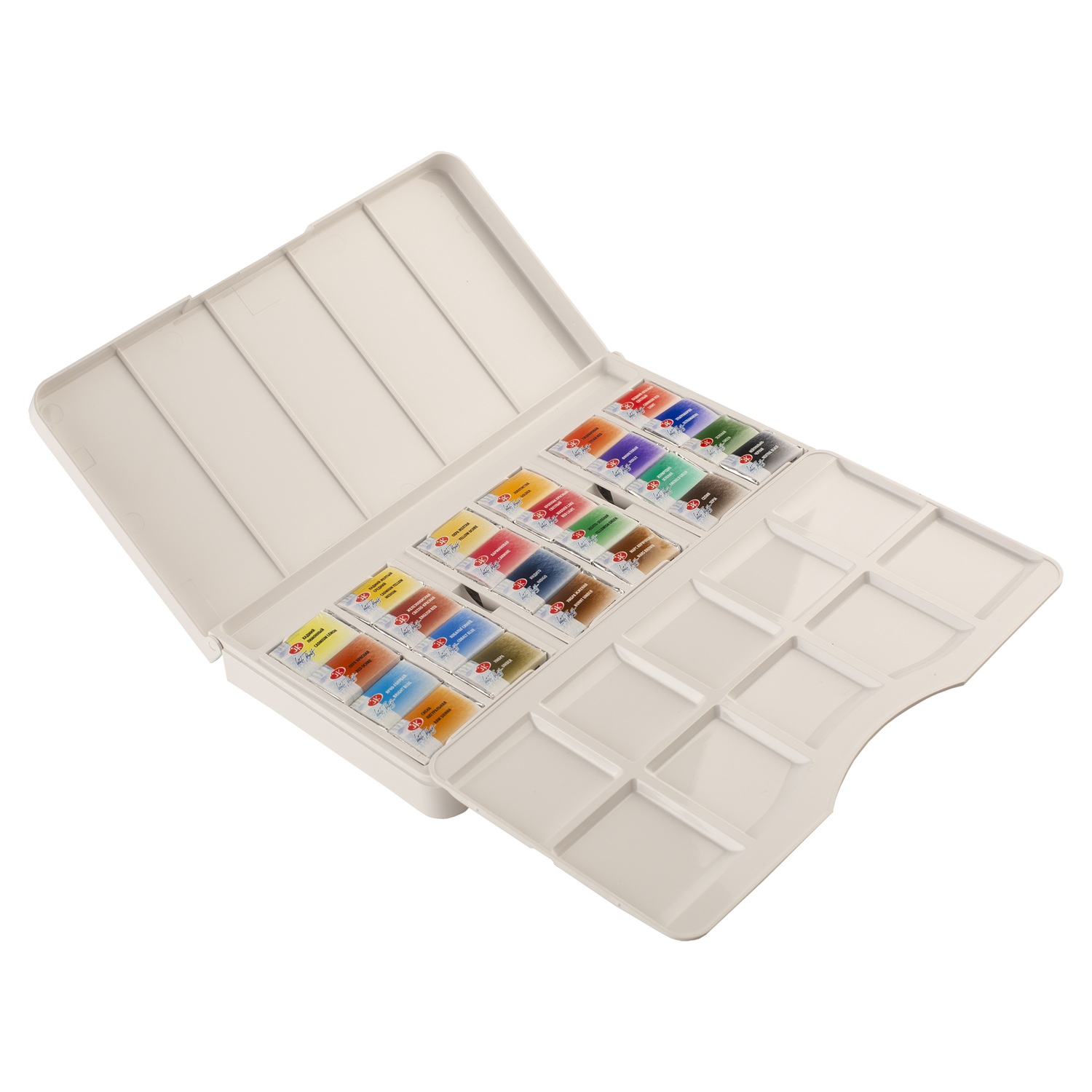 Основная часть палитры обладает высочайшим показателем светостойкости, что способствует сохранности художественных работ свыше 100 лет. Сбалансированный набор из 24 цветов позволяет решать самые сложные творческие задачи. Краски представлены в пластиковом пенале со съемной палитрой, конструкция которого предусматривает возможность расширения: в пустых нишах можно дополнительно разместить до 12 кювет, собрав индивидуальную палитру из 36 оттенков.