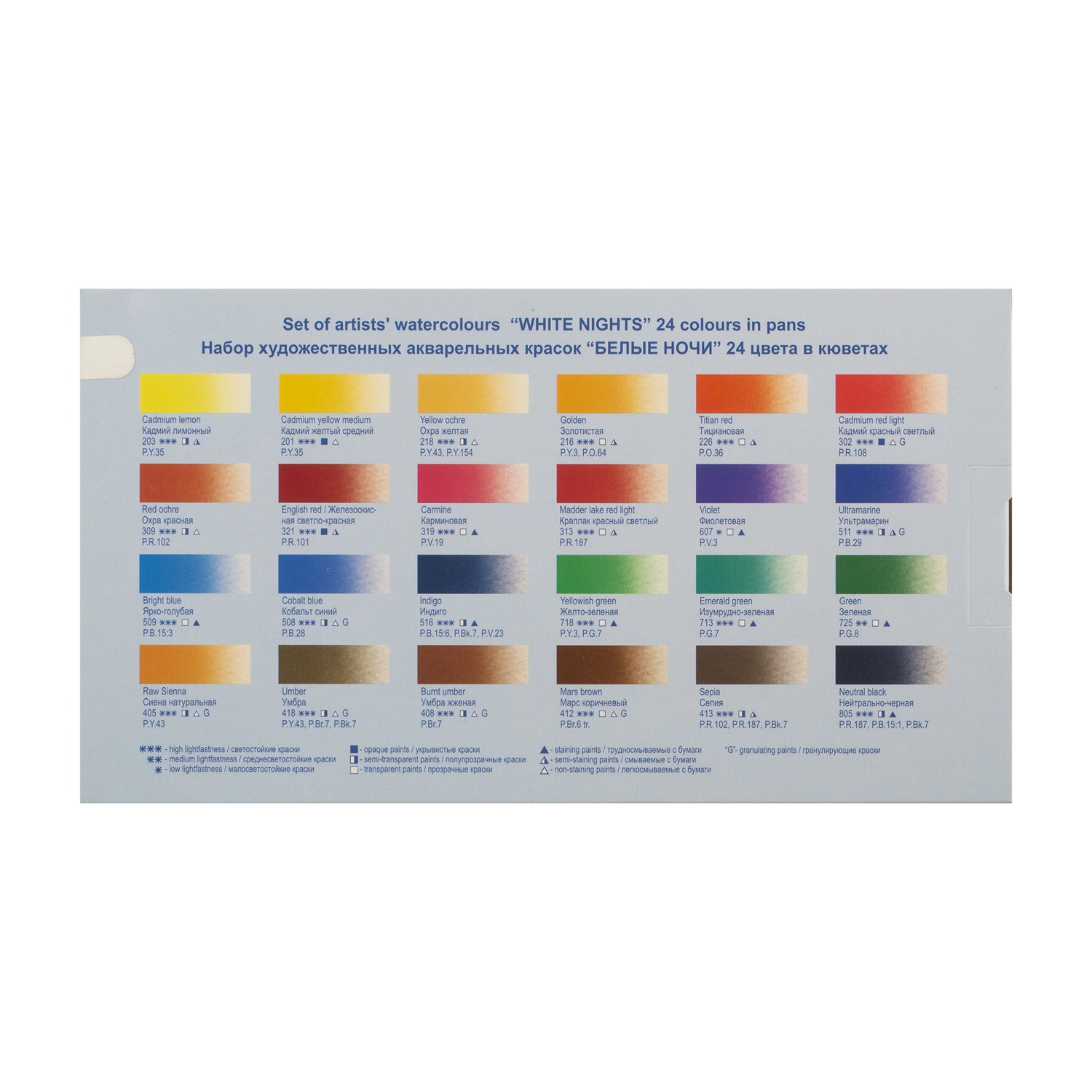 Профессиональные художественные акварельные краски «Белые ночи» представляют собой тонкодисперсные суспензии пигментов и наполнителей в связующем на основе натурального гуммиарабика. Высокая концентрация пигмента обеспечивает максимальную интенсивность цветового тона, которая сохраняется даже при сильном разбавлении водой. Краски отличаются исключительной прозрачностью, позволяя художнику работать в технике многослойных лессировок, а чистота цветов гарантирует получение богатого многообразия оттенков при смешивании.