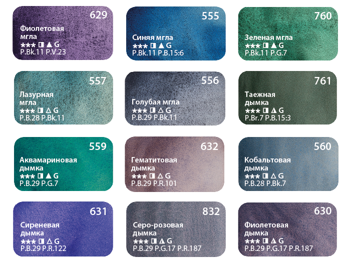 <i><u>Состав набора</u></i>: 630 Фиолетовая мгла 555 Синяя мгла 760 Зеленая мгла 557 Лазурная мгла 556 Голубая мгла Таежная дымка 559 Аквамариновая дымка 632 Гематитовая дымка 560 Кобальтовая дымка 631 Сиреневая дымка 832 Серо-розовая дымка 629 Фиолетовая дымка.<br>
