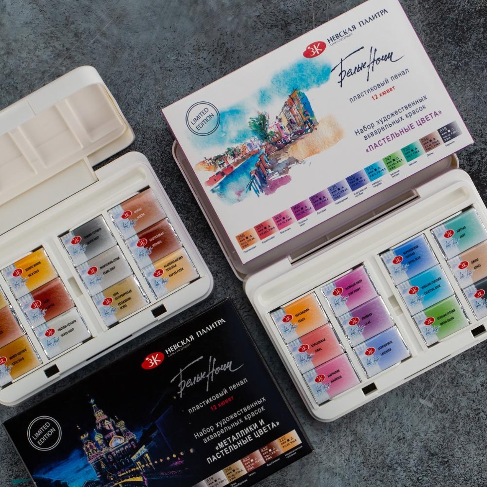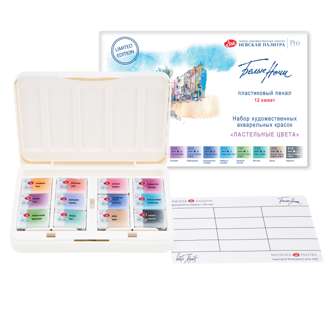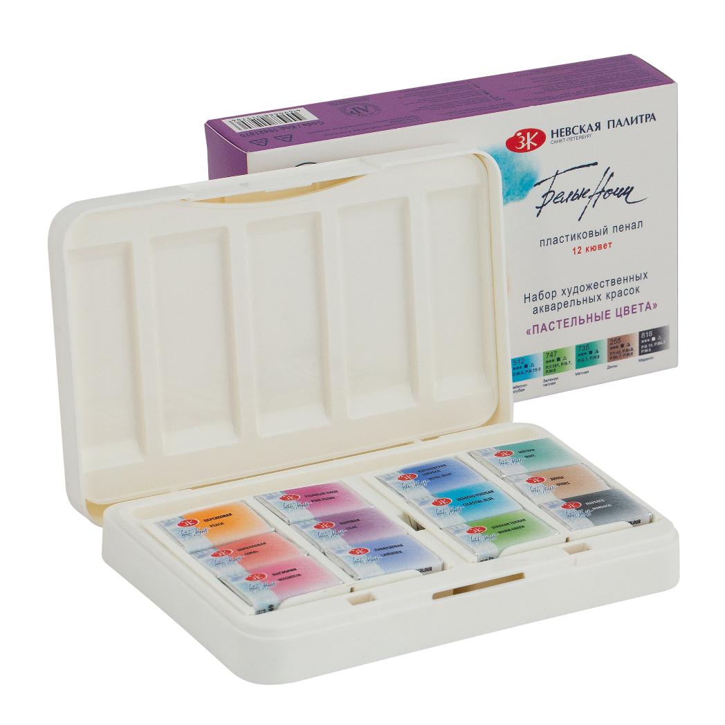 <b>Набор акварельных красок «Белые ночи» в пластиковом пенале состоит из 12 пастельных цветов.<br>