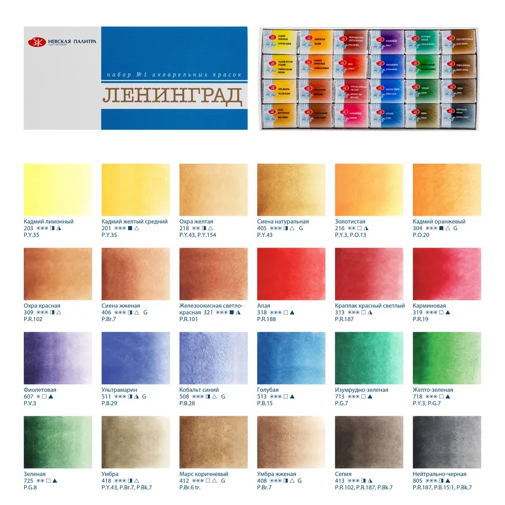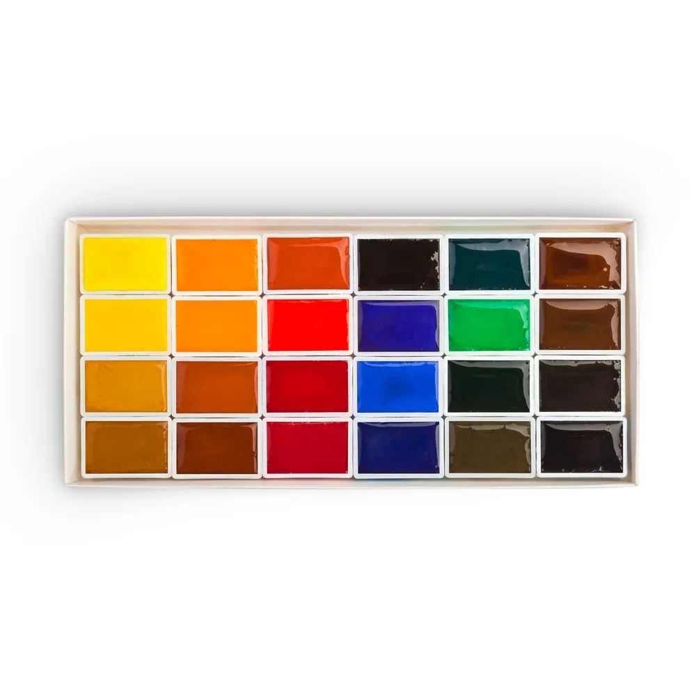 <u>Состав набора</u>: Кадмий лимонный, Кадмий желтый средний, Охра желтая, Сиена натуральная, Золотистая, Кадмий оранжевый, Охра красная, Сиена жженая, Железоокисная светло-Красная, Алая, Краплак красный светлый, Карминовая, Фиолетовая, Ультрамарин, Кобальт синий, Голубая, Изумрудно-зеленая, Желто-зеленая, Зеленая, Умбра, Марс коричневый, Умбра жженая, Сепия, Нейтрально-черная