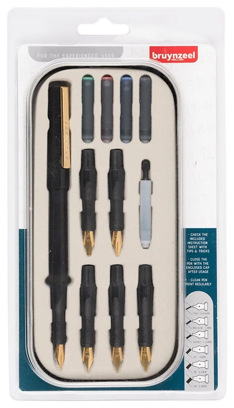Комплектация набора: перьевая ручка, 6 пишущих сменных наконечника (0,85мм, 1мм, 1,35мм, 1,6мм, два широких пера), 4 картриджа с чернилами, 4 колпачка, конвертор, пенал, инструкция. Набор упакован в прозрачную упаковку из пластика.