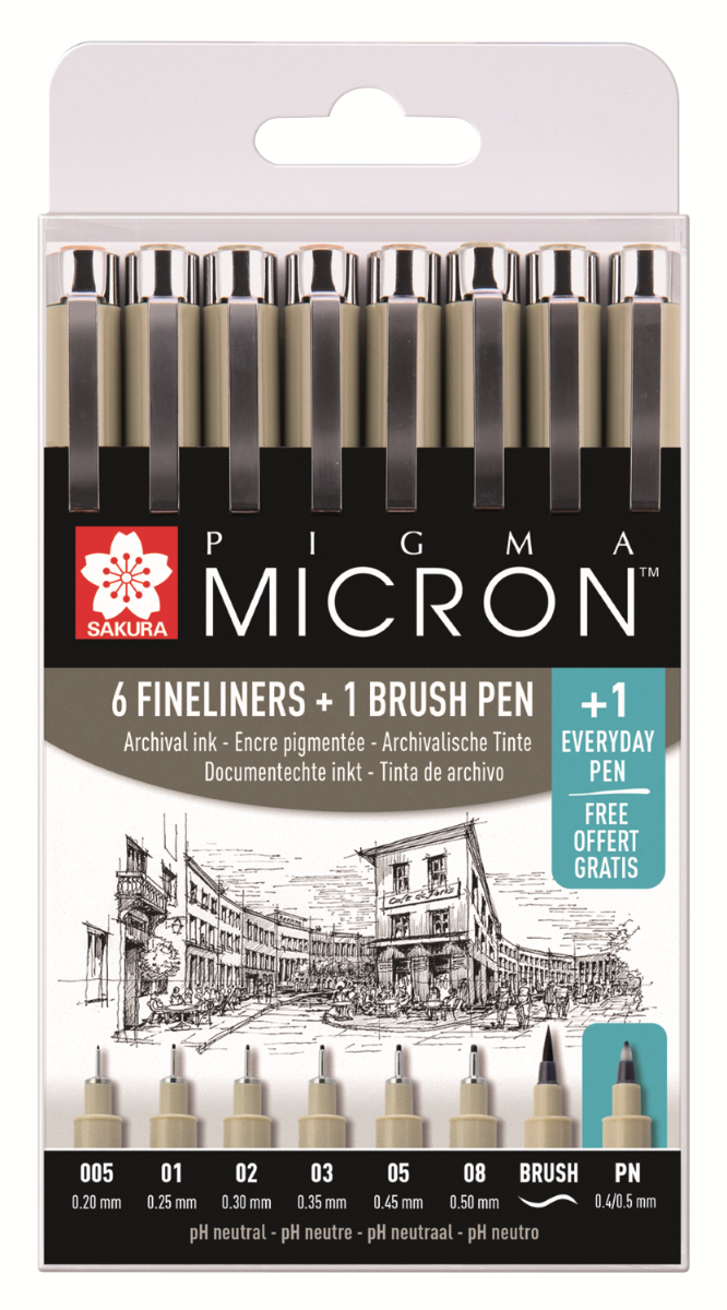 В наборе: 6 чёрных ручек Pigma Micron: 005 (0.2мм), 01 (0.25мм), 02 (0.3мм), 03 (0.35мм), 05 (0.45мм), 08 (0.5мм) 1 чёрная ручка Pigma Brush 1 чёрная ручка Pigma PN (Plastic Nib) - БЕСПЛАТНО! Размер набора: 165мм*86мм*14мм Масса набора: 88 грамм В ручках серии Pigma используются архивные чернила Pigma Ink: светостойкие (не выцветают), химически стабильные, на водной основе и пигментах (подробнее). После высыхания устойчивы к воздействию воды (не расплываются при попадании на воды на бумагу), не пачкаются, не смазываются и не проступают на оборотную сторону листа (для большинства видов бумаги) Применение Sakura Pigma Micron в творчестве: Смешанные техники: используют совместно с акварелью, акрилом, карандашами и прочими художественными материалами Скетчинг Иллюстрация и мультипликация Комиксы и манга Различные виды хобби: скрапбукинг, создание авторских открыток, пригласительных и штампов (Rubber Stamping), роспись кукол, квилтинг, и другие Медитативная техника рисования Zentangle Декоративная роспись по ткани (предпочтительно, хлопок, ткань с рисунком не рекомендуется стирать) Применение Sakura Pigma Micron в работе и повседневной жизни: Ежедневное письмо: ведение ежедневников, дневников, журналов, запись лекций Подпись официальных документов Черчение Технический рисунок Подробнее: https://www.meloman.kz/markery-ruchki-hudojestvennye-24093/nabor-linerov-pigma-micron-8-sht-chernye-v-plastikovoj-upakovke.html