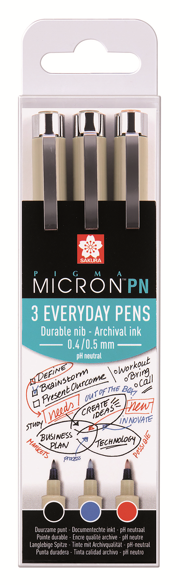 - В наборе 3 капиллярные ручки Sakura Pigma PN, цвета: черный (№49 Black), синий (№36 Blue), красный (№19 Red)