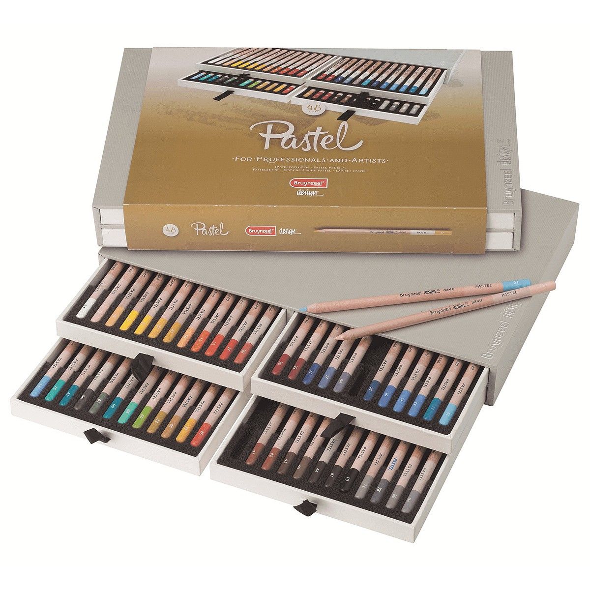 Набор пастельных карандашей серии "Design" от "Bruynzeel" состоит из 48 тщательно подобранных оттенков, которые, накладываясь друг на друга, могут дать все необходимые цвета. Набор упакован в красивую прочную коробку, где карандаши размещаются в выдвижных лотках с поролоновыми разделителями. Это прекрасный подарок как начинающему, так и опытному художнику.