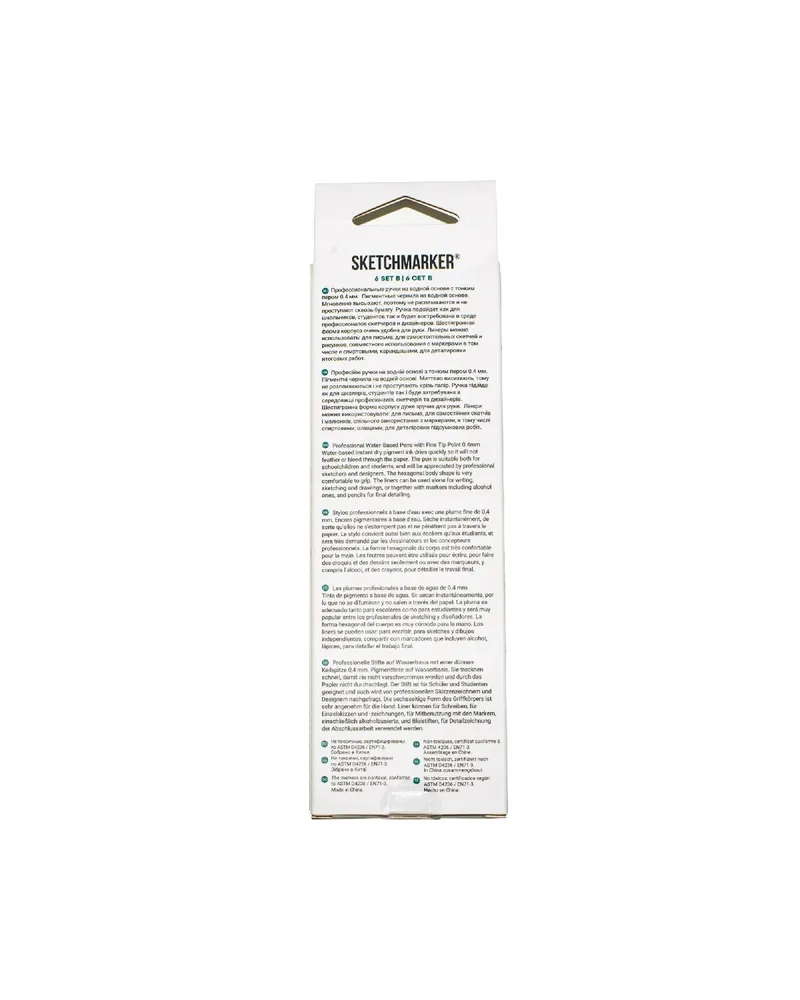 Это профессиональные капиллярные ручки на водной основе с тонким пером толщиной 0.4 мм. Внутри каждого линера Скетчмаркер Artist Pen пигментные чернила на водной основе высокого качества.