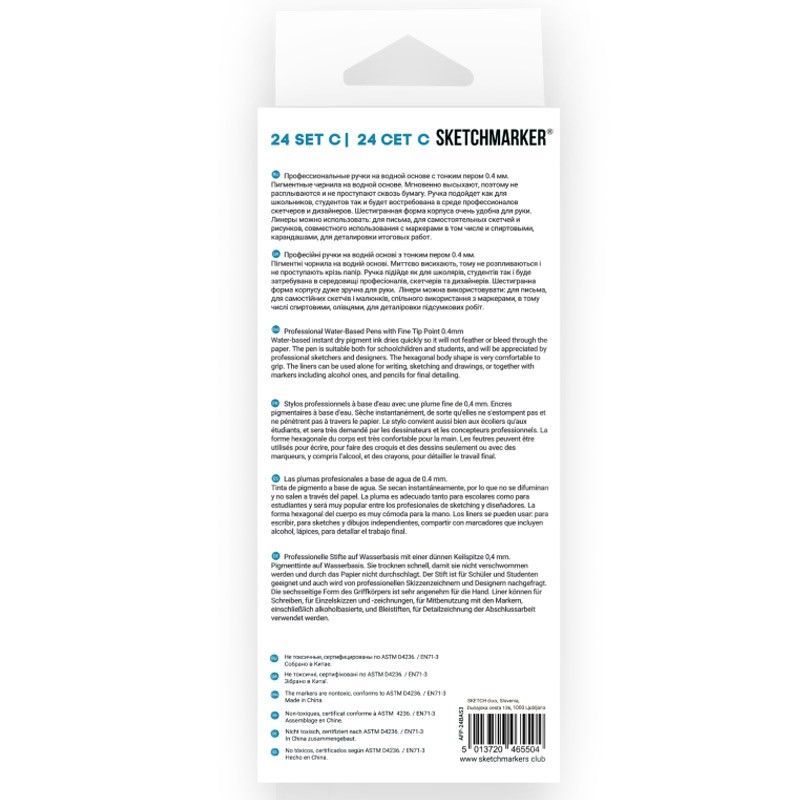 Это профессиональные капиллярные ручки на водной основе с тонким пером толщиной 0.4 мм. Внутри каждого линера Скетчмаркер Artist Pen пигментные чернила на водной основе высокого качества.