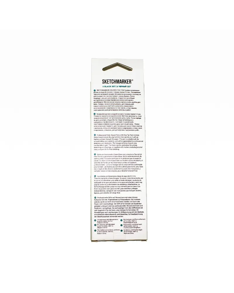 Это профессиональные капиллярные ручки на водной основе с тонким пером толщиной 0.4 мм. Внутри каждого линера Скетчмаркер Artist Pen пигментные чернила на водной основе высокого качества.