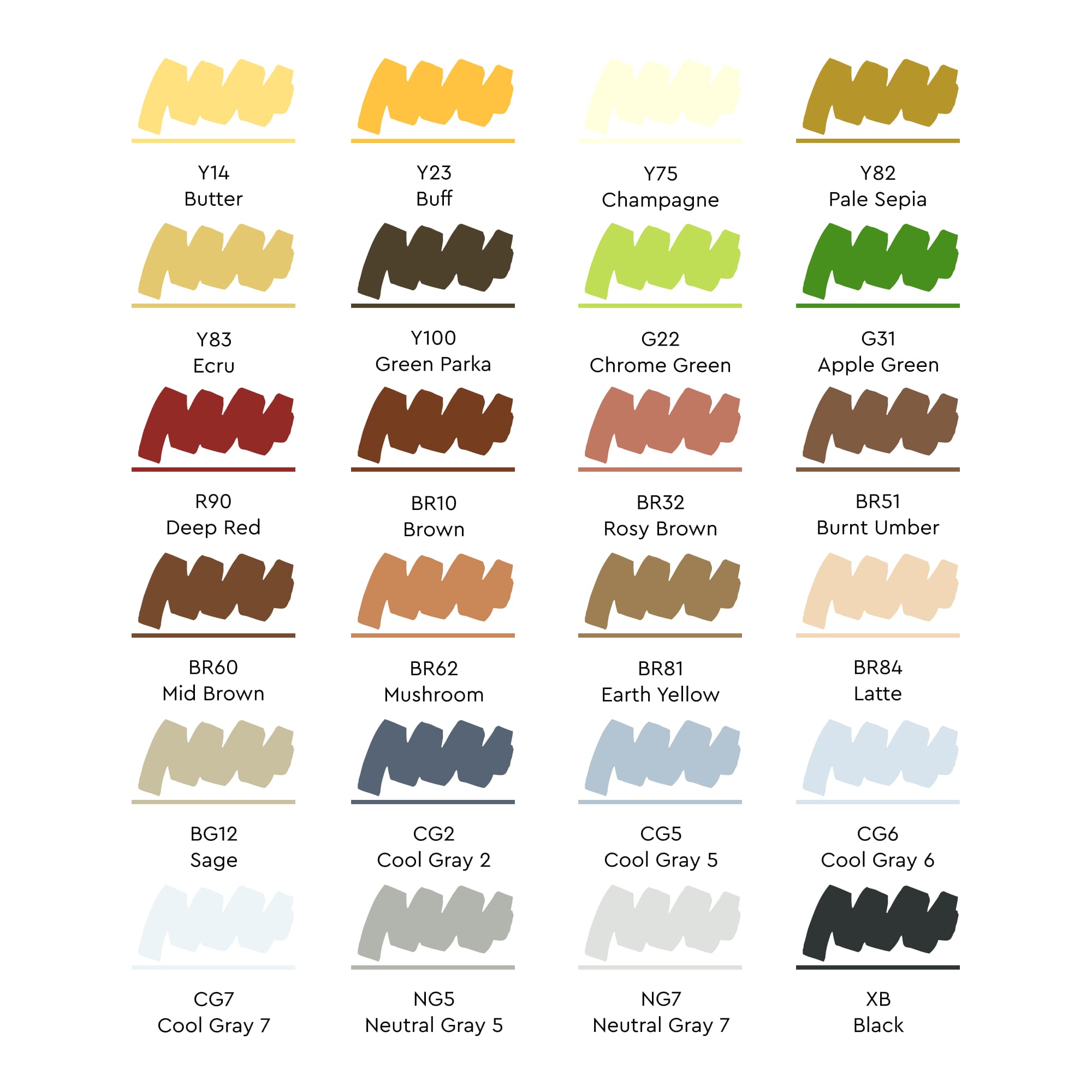 Цвета в наборе: Y14 Масло, Y21 Бамбук, Y22 Земля, Y23 Кожа буйвола, G22 Зелёный хром, G52 Зеленая трава, R90 Глубокий красный, BR20 Шоколад, BR21 Гранат, BR32 Розово-коричневый, BR40 Ван-Дик коричный, BR43 Ясень, BR62 Гриб, BR73 Лиственница, BR81 Почва, BR83 Смуглый, BG93 Бледный серый, WG5 Теплый серый 5, WG8 Теплый серый 8, CG2 Прохладный серый 2, CG4 Прохладный серый 4, CG5 Прохладный серый 5, CG8 Прохладный серый 8, XB Черный