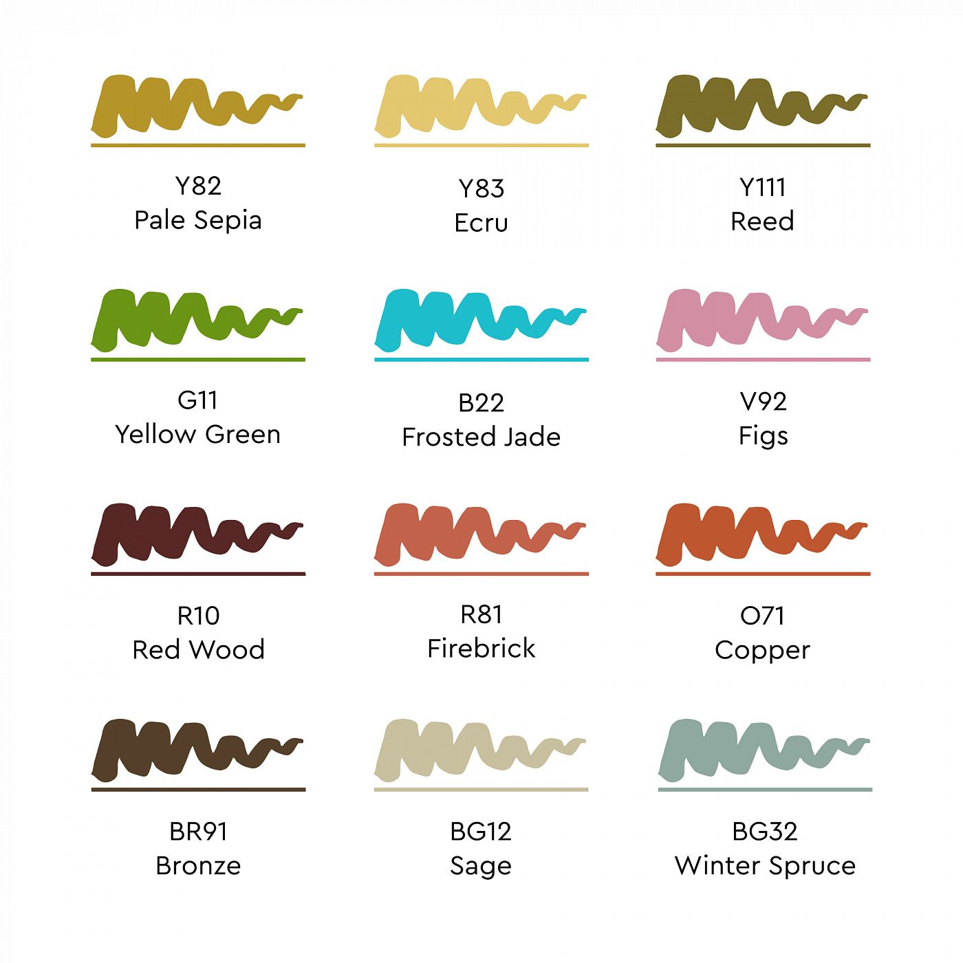 Цвета в наборе: Y64 Мягкий лайм, G43 Сельдерей, G103 Зеленая бутылка, G163 Бледно бирюзовый, B24 Детский голубой, B54 Синий зенит, V62 Бордовый шалфей, R33 Очаровательный розовый, R114 Персик, O63 Абрикос, BG93 Бледный серый, CG5 Прохладный серый 5