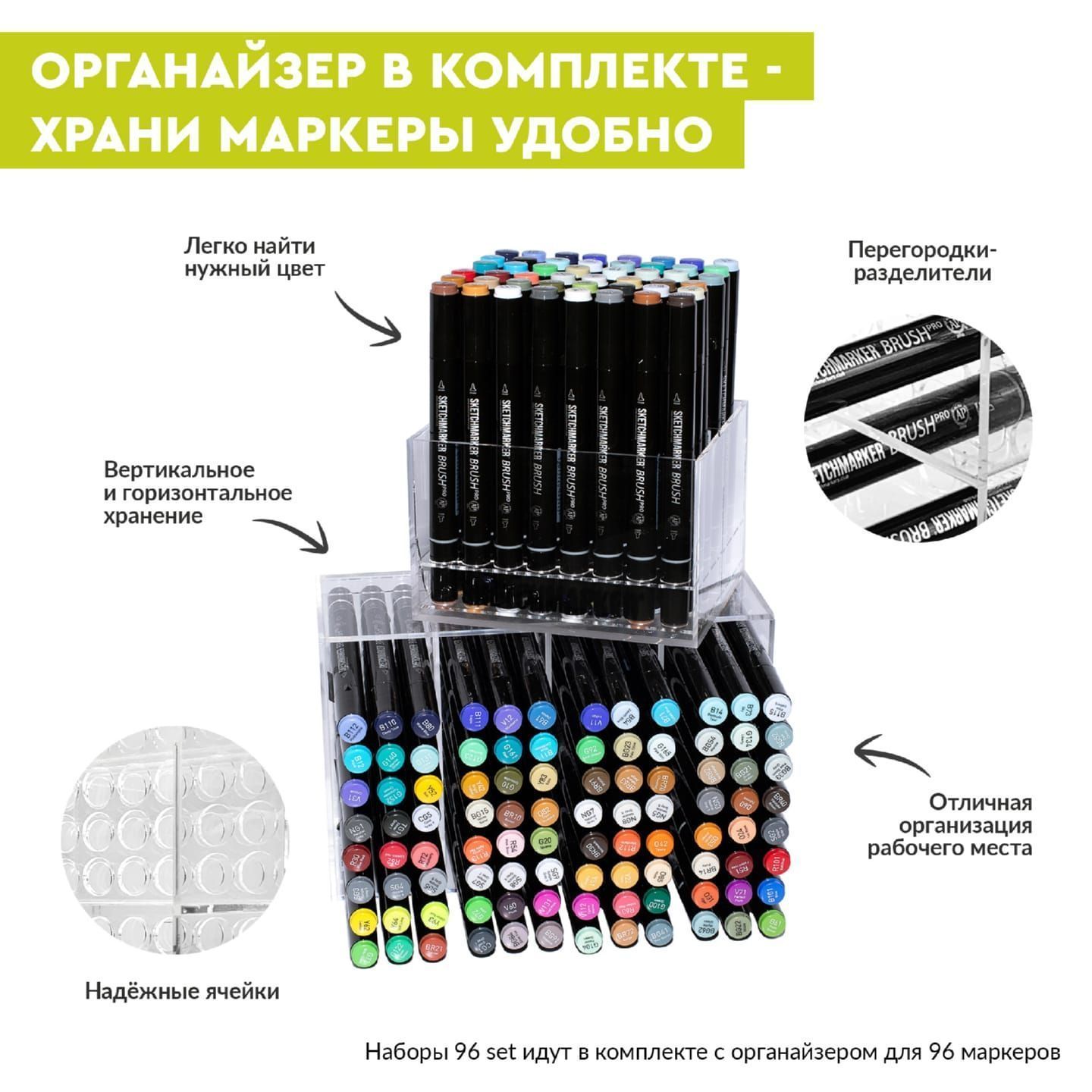 - Двусторонние спиртовые маркеры SKETCHMARKER BRUSH PRO представлены широкой палитрой из 400 невероятных оттенков - это огромный спектр для вашей фантазии, чтобы идеально подобрать и попасть в нужный цвет.