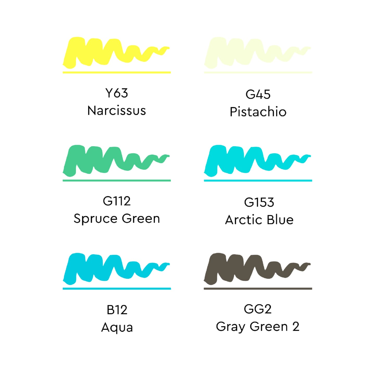 - Цвета в наборе: Y63 Нарцисс, G45 Фисташковый, G112 Зеленая ель, G153 Арктический синий, B12 Вода, GG2 Серо-зеленый 2.