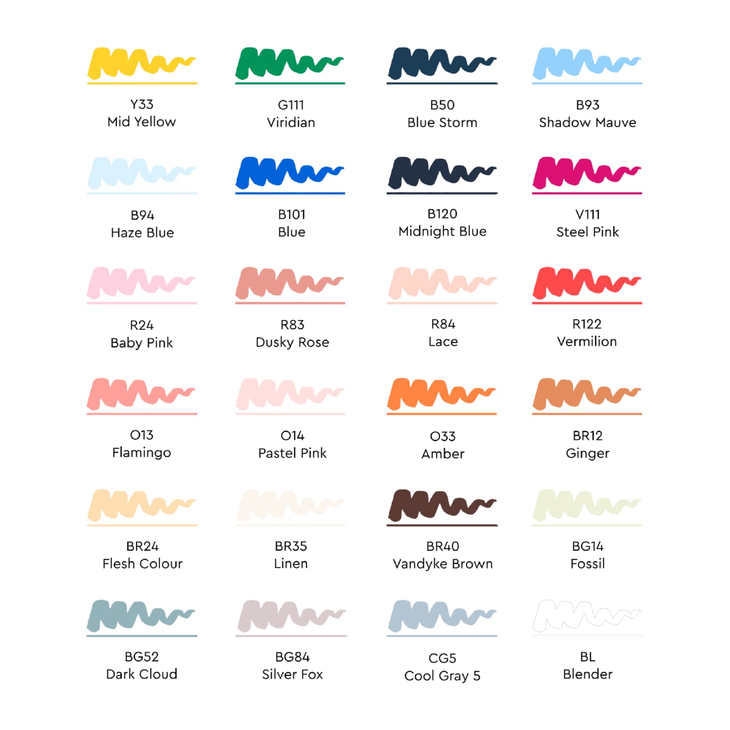 - Цвета в наборе: Y33 Средний желтый, G111 Голубовато зеленый, B50 Синий шторм, B93 Сиреневая тень, B94 Дымчатый голубой, B101 Синий, B120 Полночный синий, V111 Розовая сталь, R24 Детский розовый, R83 Тёмная роза, R84 Кружева, R122 Ярко красный, O13 Фламинго, O14 Пастельный розовый, O33 Янтарный, BR12 Имбирь, BR24 Телесный цвет, BR35 Льняное полотно, BR40 Ван-Дик коричный, BG14 Окаменелость, BG52 Темное облако, BG84 Черно-бурая лисица, CG5 Прохладный серый 5, BL Блендер.