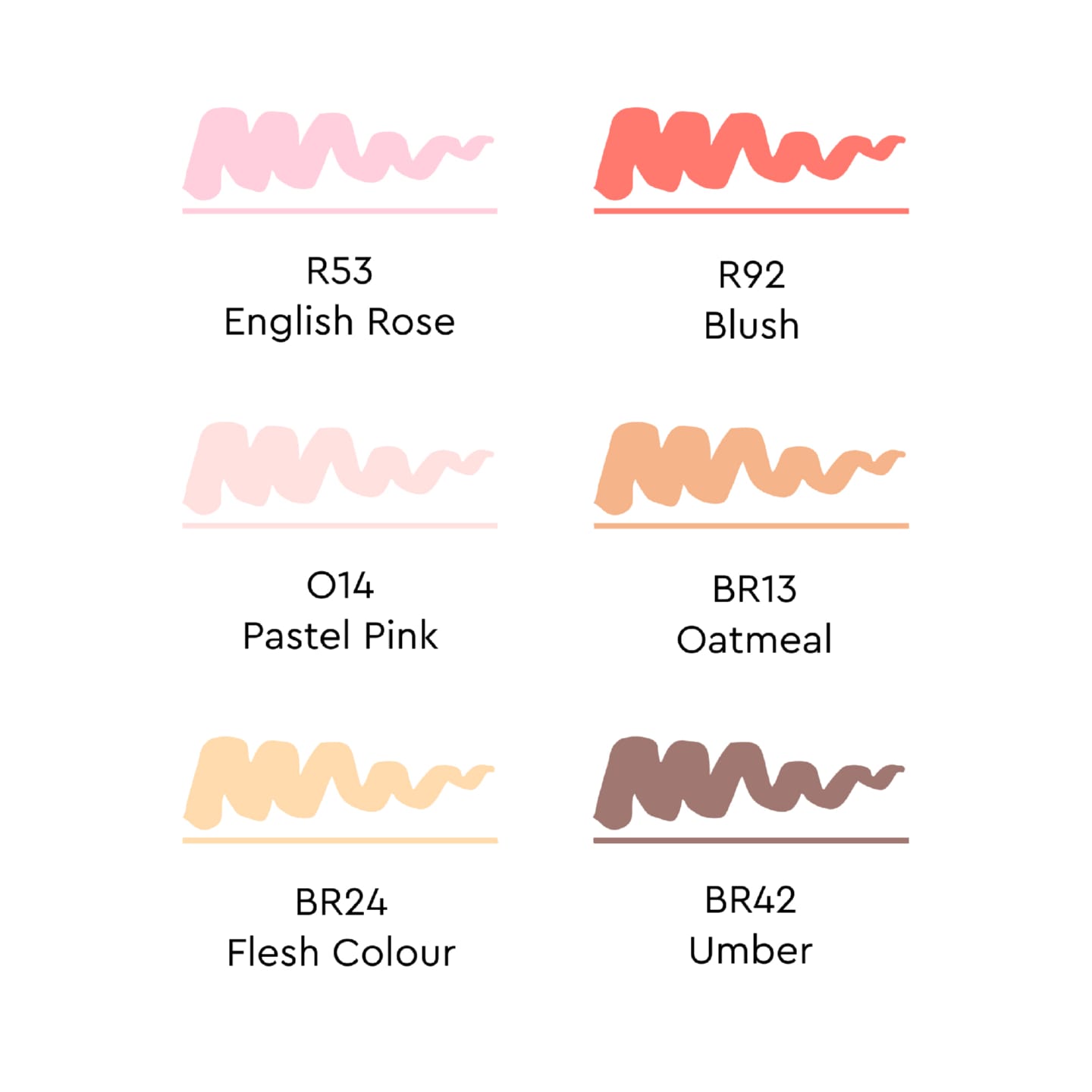 - Цвета в наборе: R53 Английская роза, R92 Румянец, O14 Пастельный розовый, BR13 Овсянка, BR24 Телесный цвет, BR42 Умбра.
