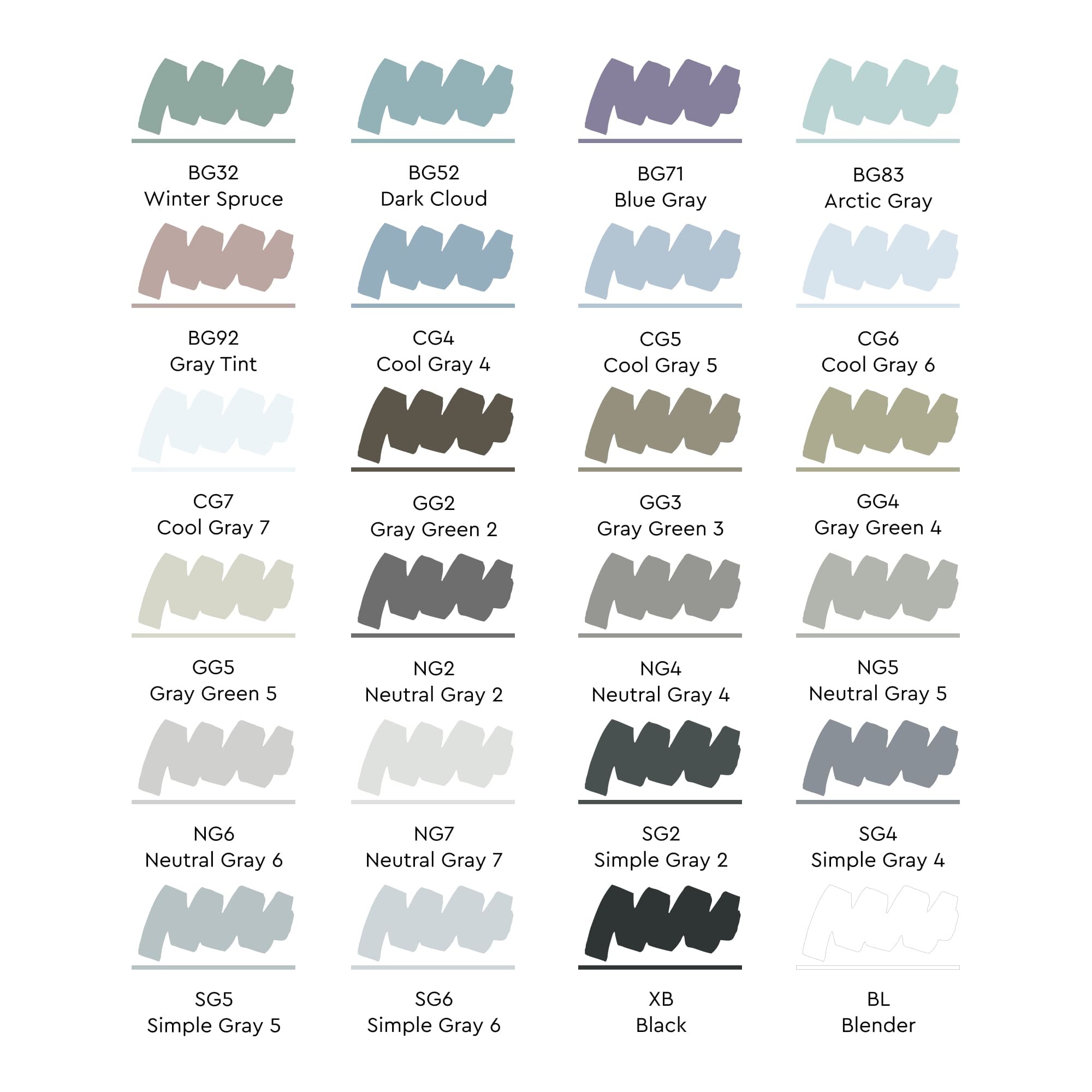 Цвета в наборе: BG32 Зимняя ель, BG52 Темное облако, BG71 Сине-серый, BG83 Арктический серый, BG92 Серый насыщенный, CG4 Холодный серый 4, CG5 Холодный серый 5, CG6 Холодный серый 6, CG7 Холодный серый 7, GG2 Серо-зеленый 2, GG3 Серо-зеленый 3, GG4 Серо-зеленый 4, GG5 Серо-зеленый 5, NG2 Нейтральный серый 2, NG4 Нейтральный серый 4, NG5 Нейтральный серый 5, NG6 Нейтральный серый 6, NG7 Нейтральный серый 7, SG2 Простой серый 2, SG4 Простой серый 4, SG5 Простой серый 5, SG6 Простой серый 6, XB Черный, BL Блендер