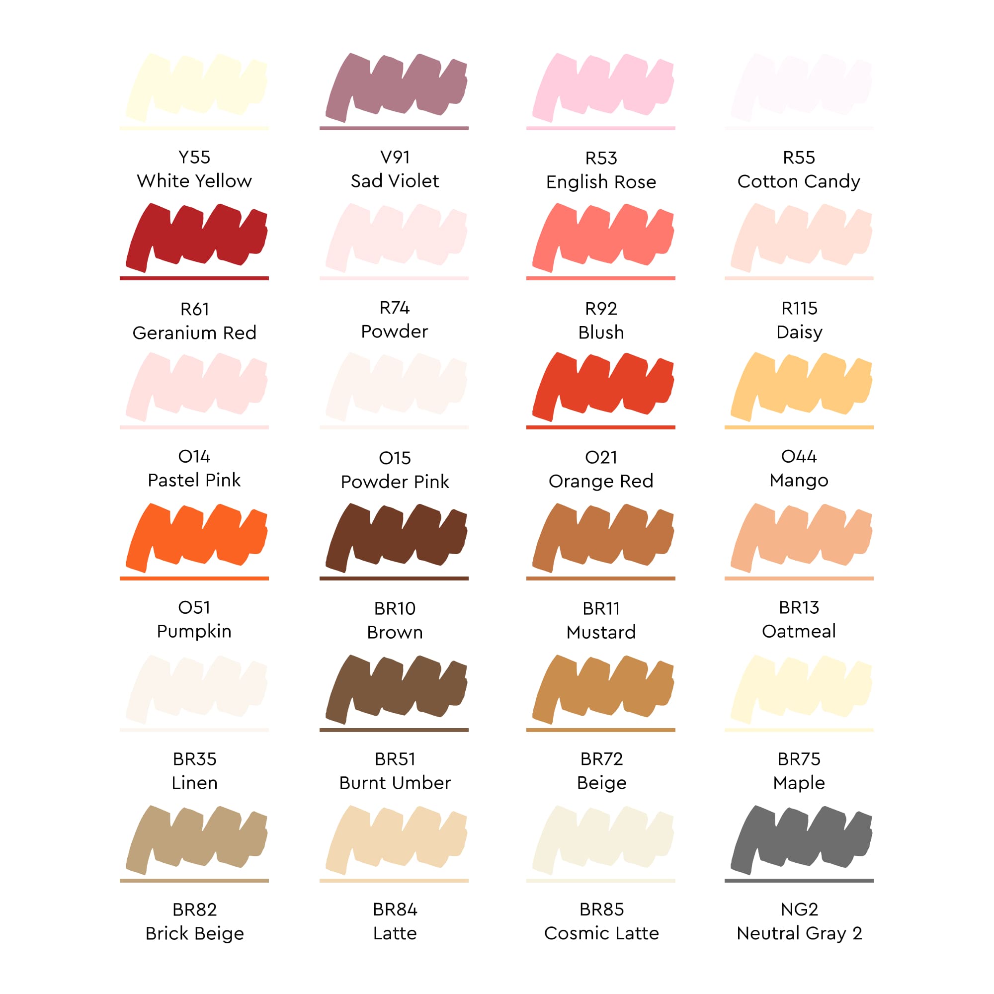 Цвета в наборе: Y55 Бело-жёлтый, V91 Тусклый фиолетовый, R53 Английская роза, R55 Сахарная вата, R61 Красная герань, R74 Пудра, R92 Румянец, R115 Маргаритка, O14 Пастельный розовый, O15 Розовая пудра, O21 Оранжево-красный, O44 Манго, O51 Тыква, BR10 Коричневый, BR11 Горчица, BR13 Овсянка, BR35 Льняное полотно, BR51 Жженая умбра, BR72 Бежевый, BR75 Клён, BR82 Бежевый кирпич, BR84 Латте, BR85 Космическое латте, NG2 Нейтральный серый 2