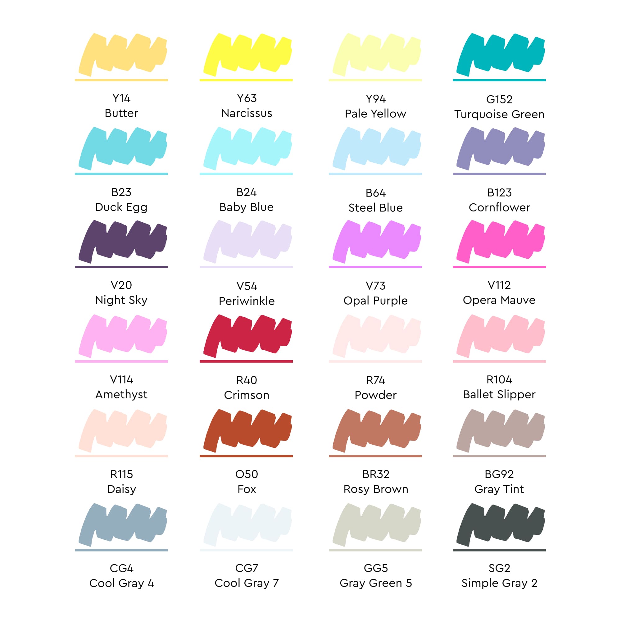 Цвета в наборе: Y14 Масло, Y63 Нарцисс, Y94 Бледно Желтый, G152 Бирюзово-зеленый, B23 Утиное яйцо, B24 Детский голубой, B64 Синяя сталь, B123 Василек, V20 Ночное небо, V54 Барвинок, V73 Фиолетовый опал, V112 Красно-фиолетовый, V114 Аметист, R40 Малиновый, R74 Пудра, R104 Пуанты, R115 Маргаритка, O50 Лиса, BR32 Розово-коричневый, BG92 Серый насыщенный, CG4 Прохладный серый 4, CG7 Прохладный серый 7, GG5 Серо зеленый 5, SG2 Простой серый 2