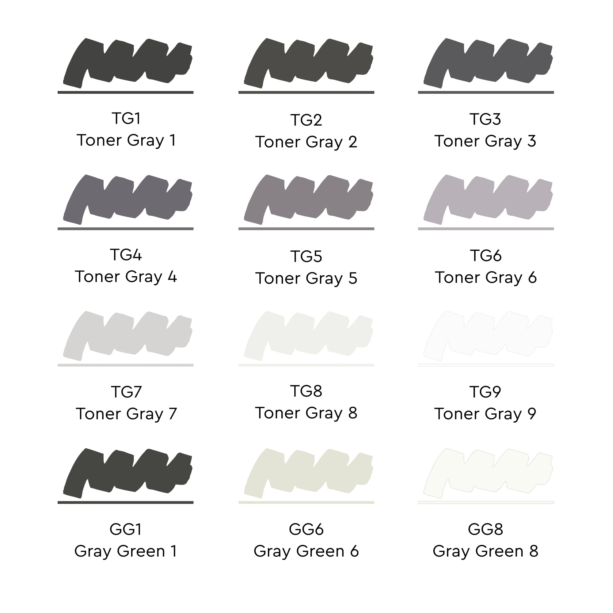 Цвета в наборе: NG1 Нейтральный серый 1, NG3 Нейтральный серый 3, NG5 Нейтральный серый 5, NG6 Нейтральный серый 6, NG7 Нейтральный серый 7, NG8 Нейтральный серый 8.