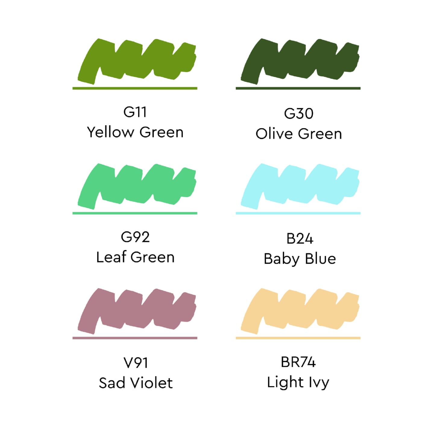 Цвета в наборе: G11 Желто зеленый, G30 Оливковый зеленый, G92 Зеленый лист, B24 Детский голубой, V91 Тусклый фиолетовый, BR74 Плющ светлый