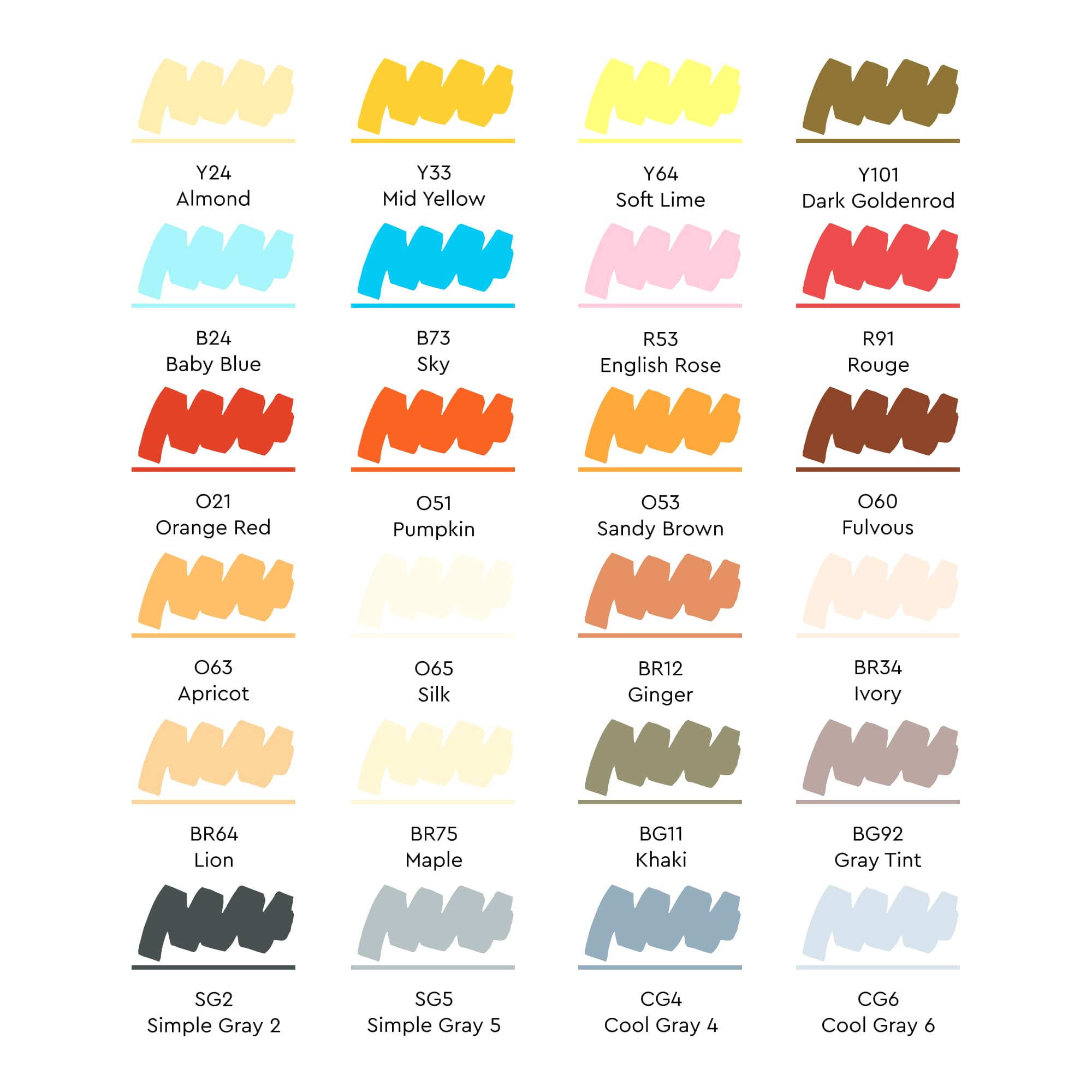 Цвета в наборе: Y24 Миндальный, Y33 Средний желтый, Y64 Мягкий лайм, Y101 Темный золотистый, B24 Детский голубой, B73 Небесный, R53 Английская роза, R91 Румяна, O21 Оранжево-красный, O51 Тыква, O53 Песок коричневый, O60 Бурый, O63 Абрикос, O65 Шёлк, BR12 Имбирь, BR34 Слоновая кость, BR64 Лев, BR75 Клён, BG11 Хаки, BG92 Серый насыщенный,SG2 Простой серый 2, SG5 Простой серый 5, CG4 Прохладный серый 4, CG6 Прохладный серый 6