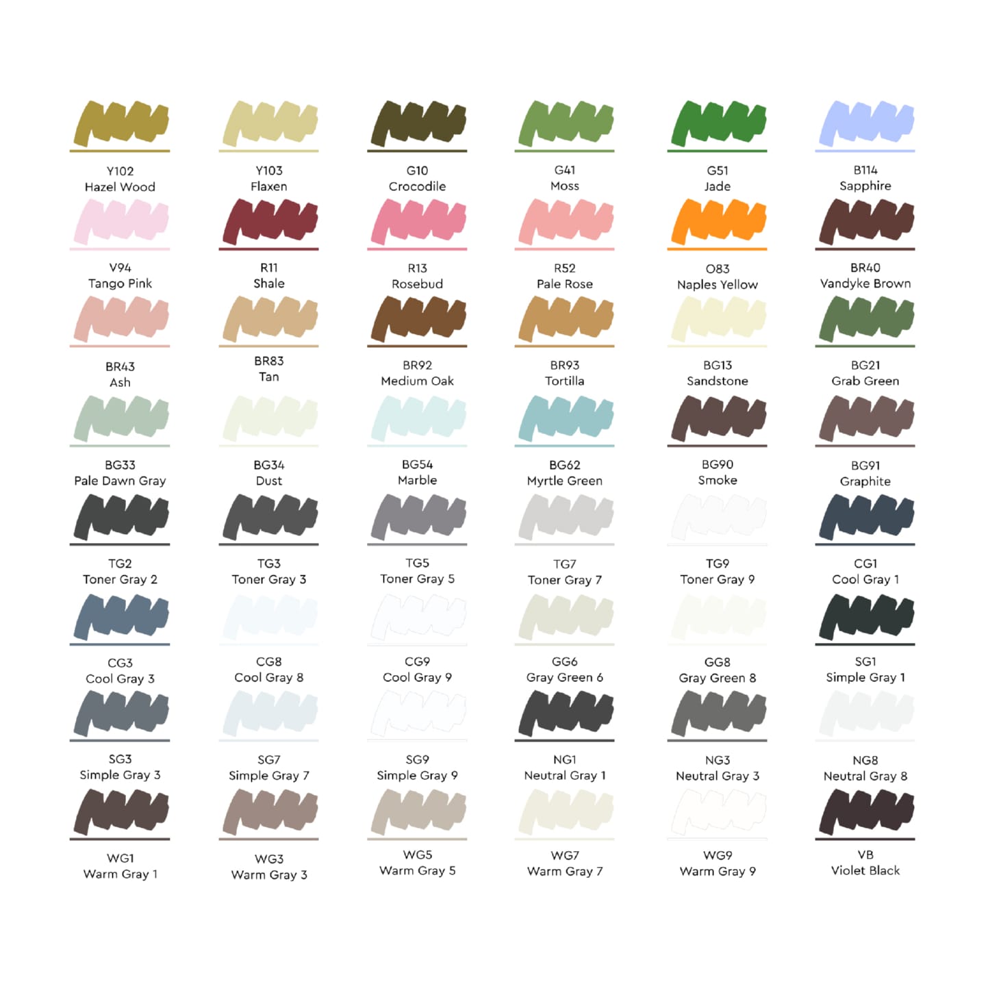 - WG1 Теплый серый 1, WG3 Теплый серый 3, WG5 Теплый серый 5, WG7 Теплый серый 7, WG9 Теплый серый 9, VB Фиолетово-черный