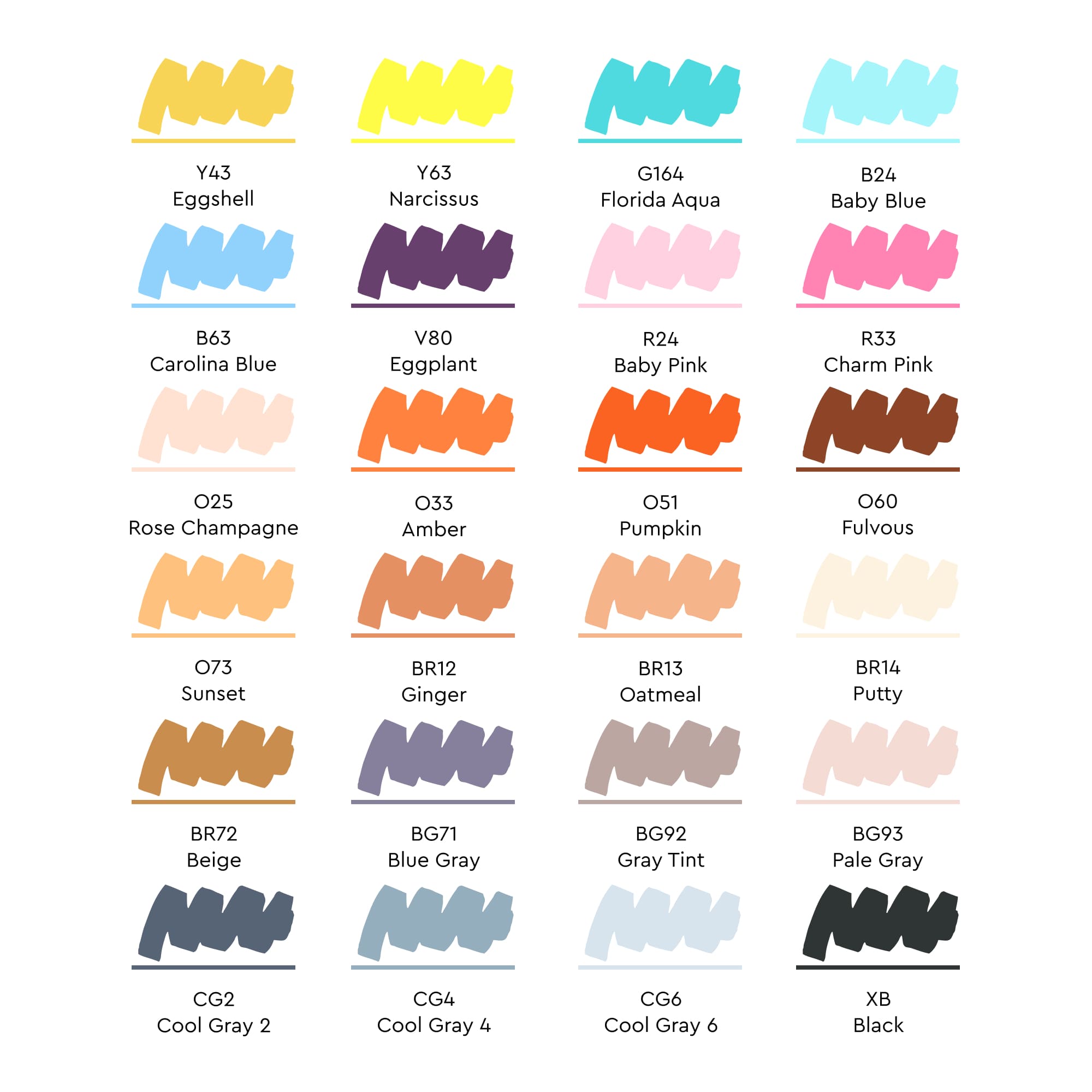 Цвета в наборе: Y43 Яичная скорлупа, Y63 Нарцисс, G164 Флоридская вода, B24 Детский голубой, B63 Синяя Каролина, V80 Баклажан, R24 Детский розовый, R33 Очаровательный розовый, O25 Розовое шампанское, O33 Янтарь, O51 Тыква, O60 Бурый, O73 Закат, BR12 Имбирь, BR13 Овсянка, BR14 Шпатлевка, BR72 Бежевый, BG71 Сине-серый, BG92 Серый насыщенный, BG93 Бледный серый, CG2 Холодный серый 2, CG4 Холодный серый 4, CG6 Холодный серый 6, XB Черный.