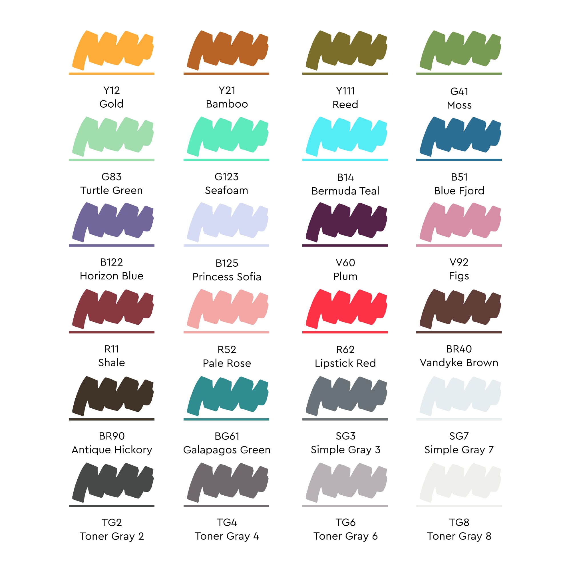 Цвета в наборе: Y12 Золото, Y21 Бамбук, Y111 Камыш, G41 Мох, G83 Зеленая черепаха, G123 Морская пена, B14 Бермудская бирюза, B51 Синий фьорд, B122 Синий горизонт, B125 Принцесса София, V60 Слива, V92 Инжир, R11 Сланец, R52 Бледно розовый, R62 Красная помада, BR40 Вандик коричный, BR90 Античный Хикори, BG61 Галапагосский зеленый, SG3 Простой серый 3, SG7 Простой серый 7, TG2 Тонированный серый 2, TG4 Тонированный серый 4, TG6 Тонированный серый 6, TG8 Тонированный серый 8.