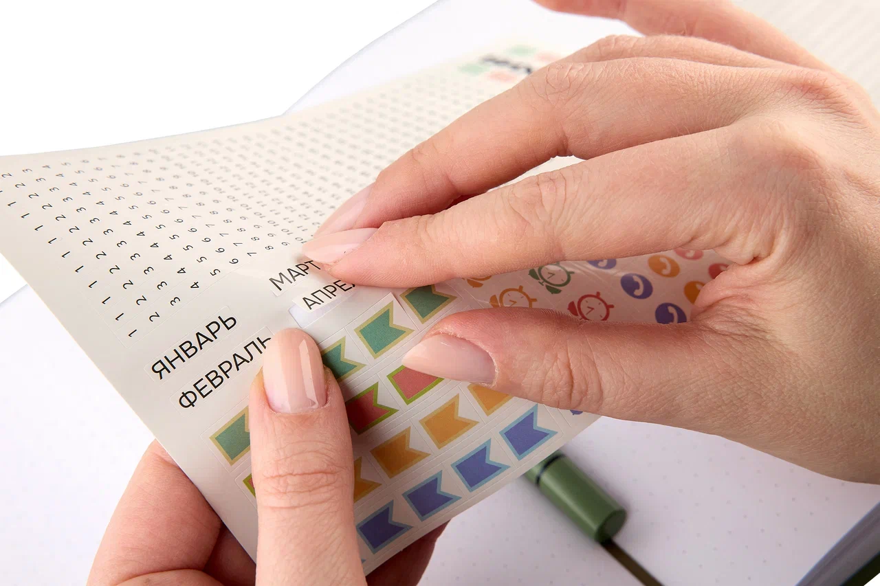 - Удобство использования: Внутренний блок в точку позволяет легко рисовать схемы, трекеры и таблицы. Нумерация страниц и лента-закладка упрощают навигацию. В комплекте также есть наклейки-маркировки для визуального выделения задач и инструкция по системе Bullet Journal, которая поможет новичкам быстро освоить метод.