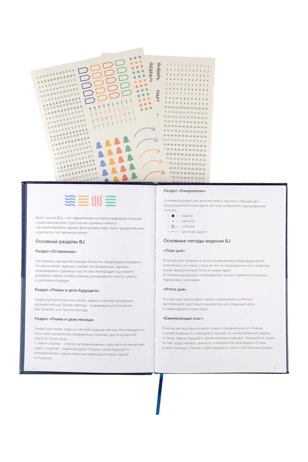 - Удобство использования: Внутренний блок в точку позволяет легко рисовать схемы, трекеры и таблицы. Нумерация страниц и лента-закладка упрощают навигацию. В комплекте также есть наклейки-маркировки для визуального выделения задач и инструкция по системе Bullet Journal, которая поможет новичкам быстро освоить метод.