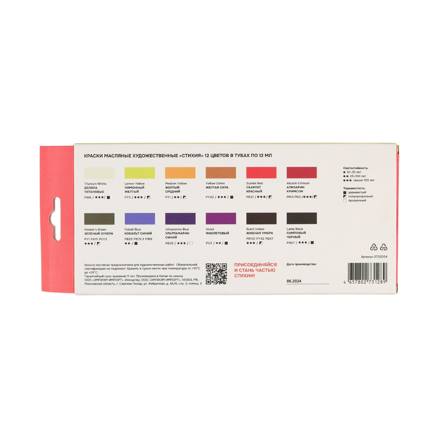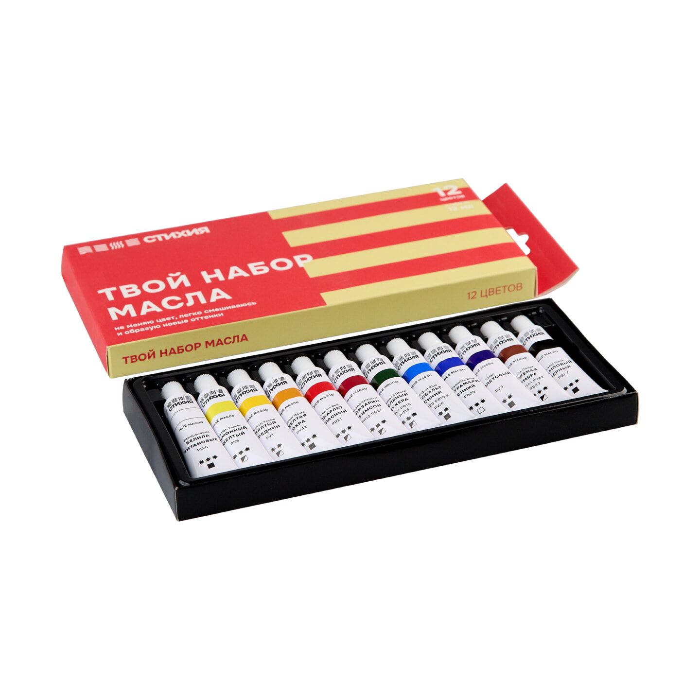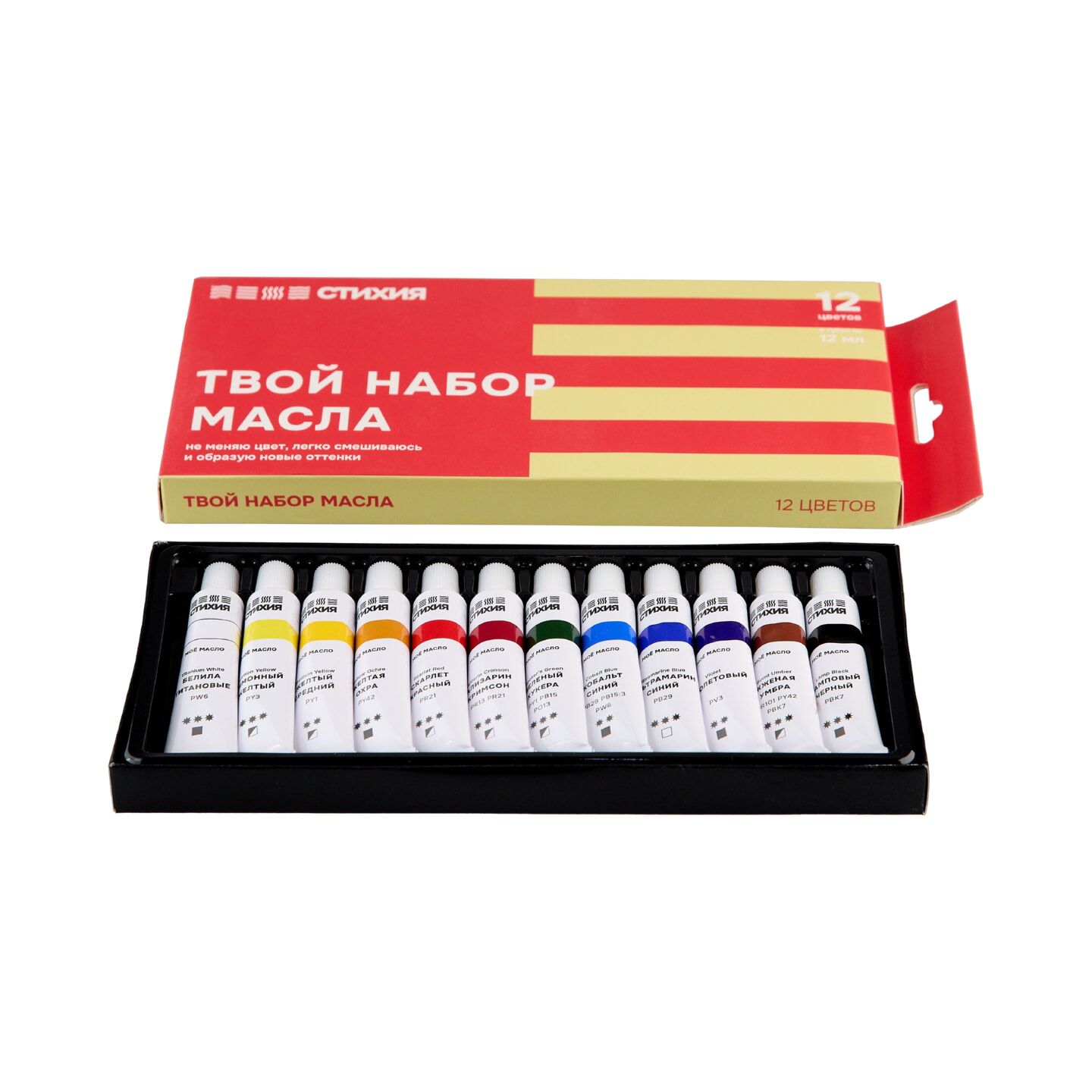 Набор масляных красок СТИХИЯ – это сбалансированная палитра из 12 цветов, подобранная и созданная в сотрудничестве с художниками.