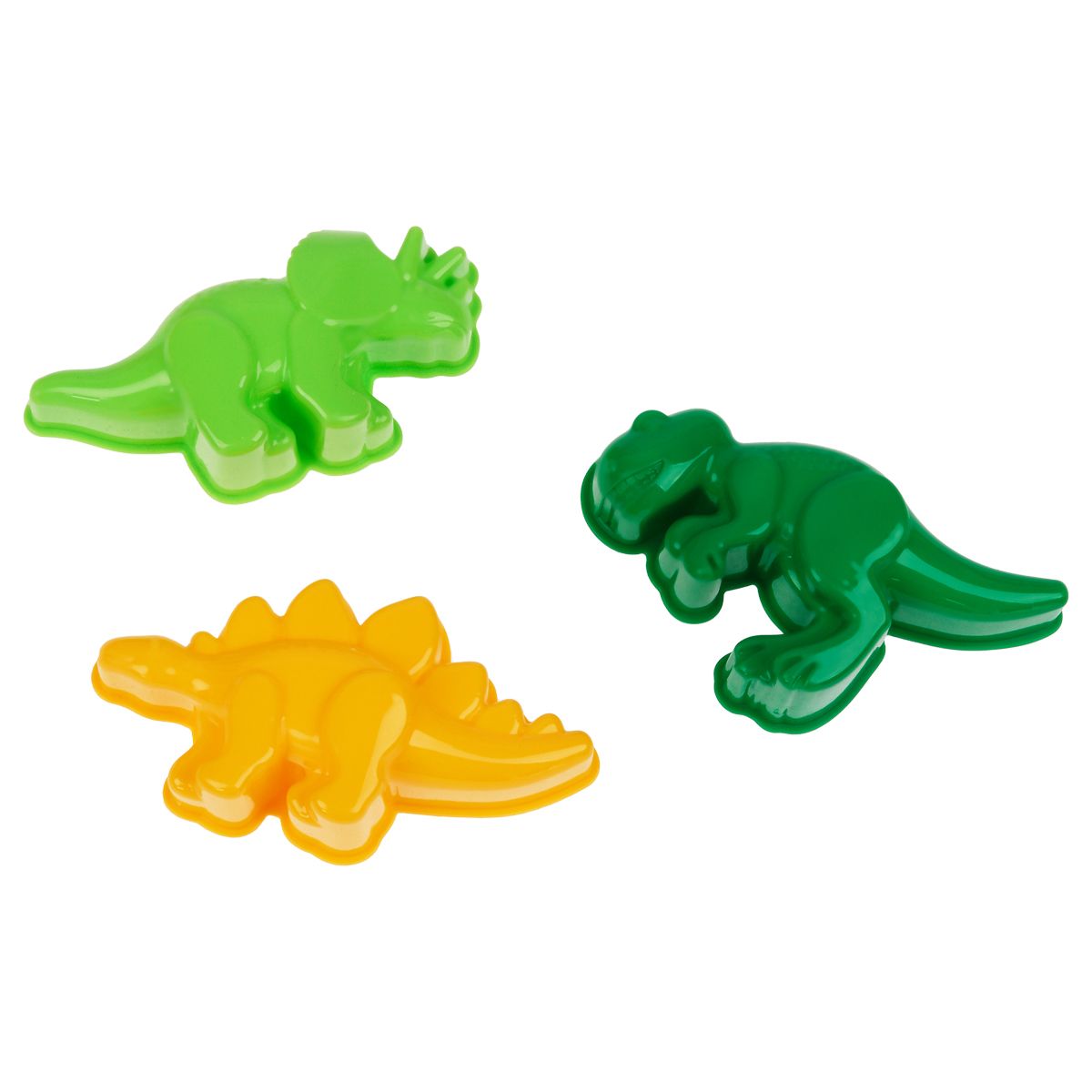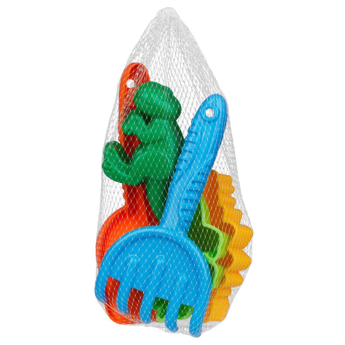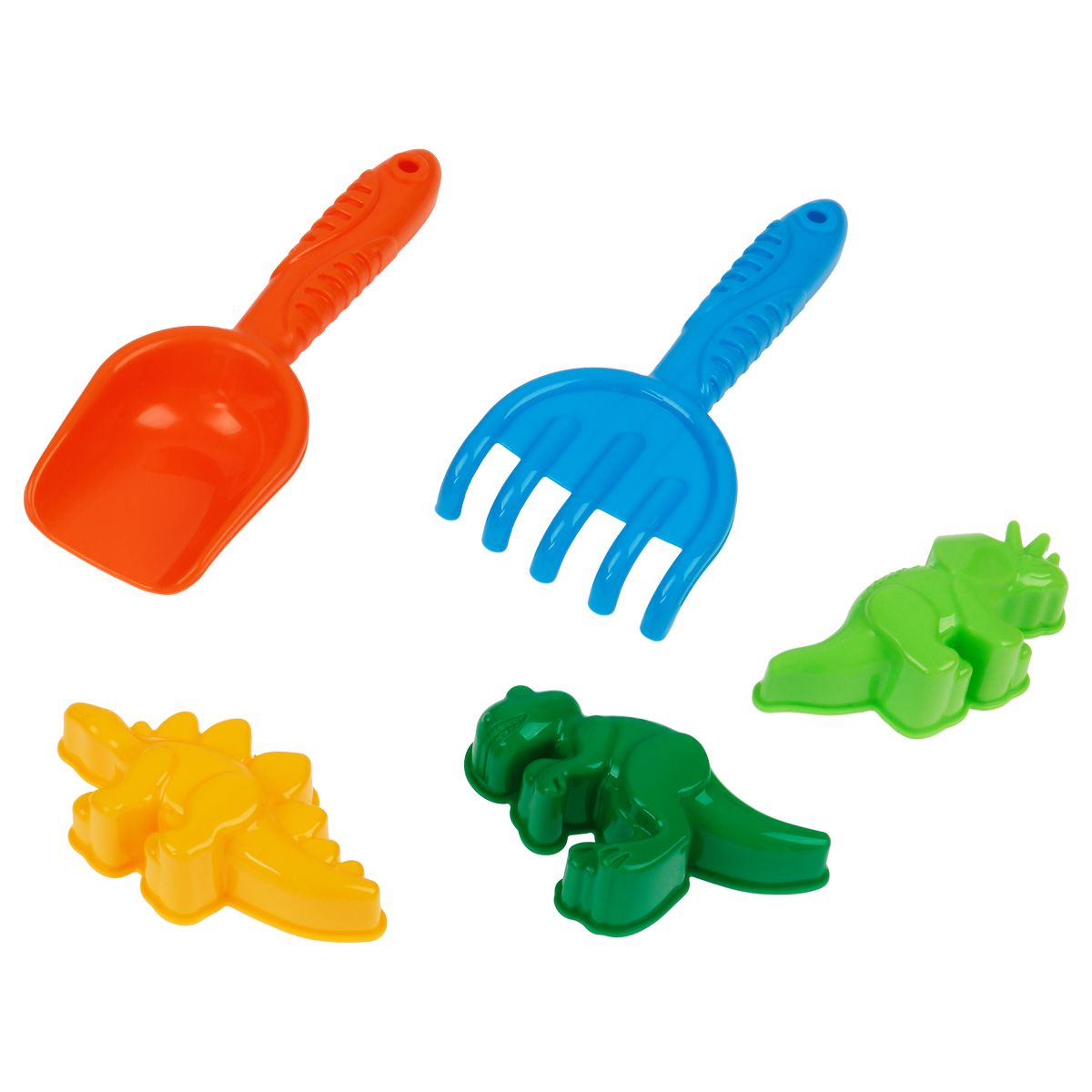 В набор «Динозавры» входят 5 предметов: совок и грабли с рельефными ручками, и три формочки, которые перенесут ребенка в прошлое и оживят настоящих динозавриков.