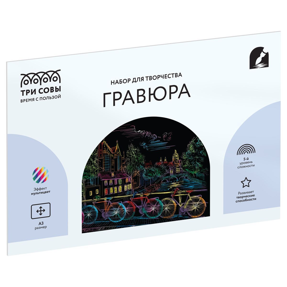 Гравюра «ТРИ СОВЫ» — это увлекательный, популярный, а главное несложный вид творчества, который будет интересен не только детям, но и взрослым. В набор «Амстердам» входит мультицветная основа формата А3, штихель и крепление на стену.