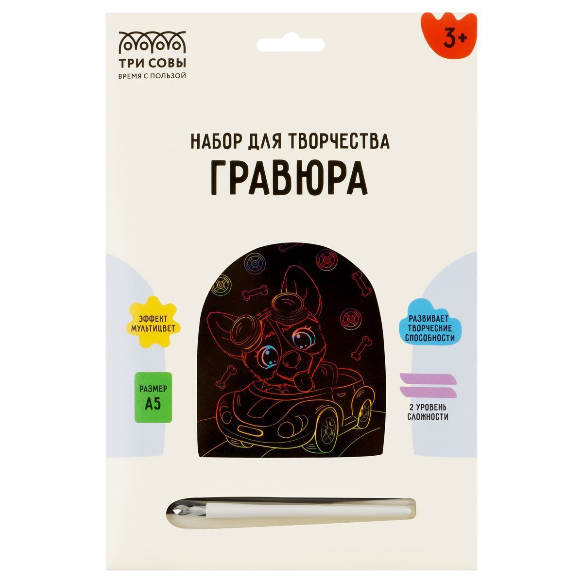 Гравюра с мультицветной основой «ТРИ СОВЫ» «Гонщик» — занимательный, увлекательный и несложный для ребенка вид творчества, который научит аккуратности и усидчивости.