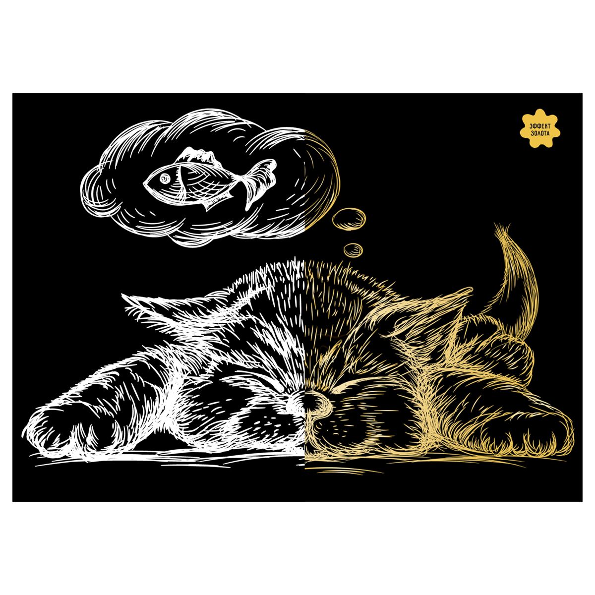 В набор «Спящий кот» входит основа с эффектом золота формата А5, штихель и крепление на стену.