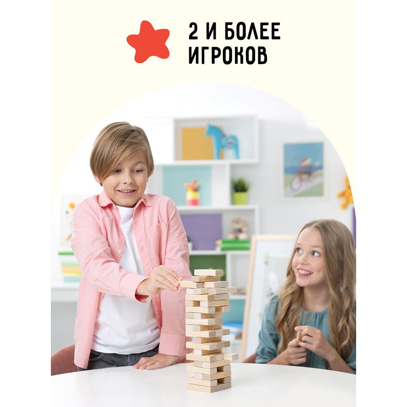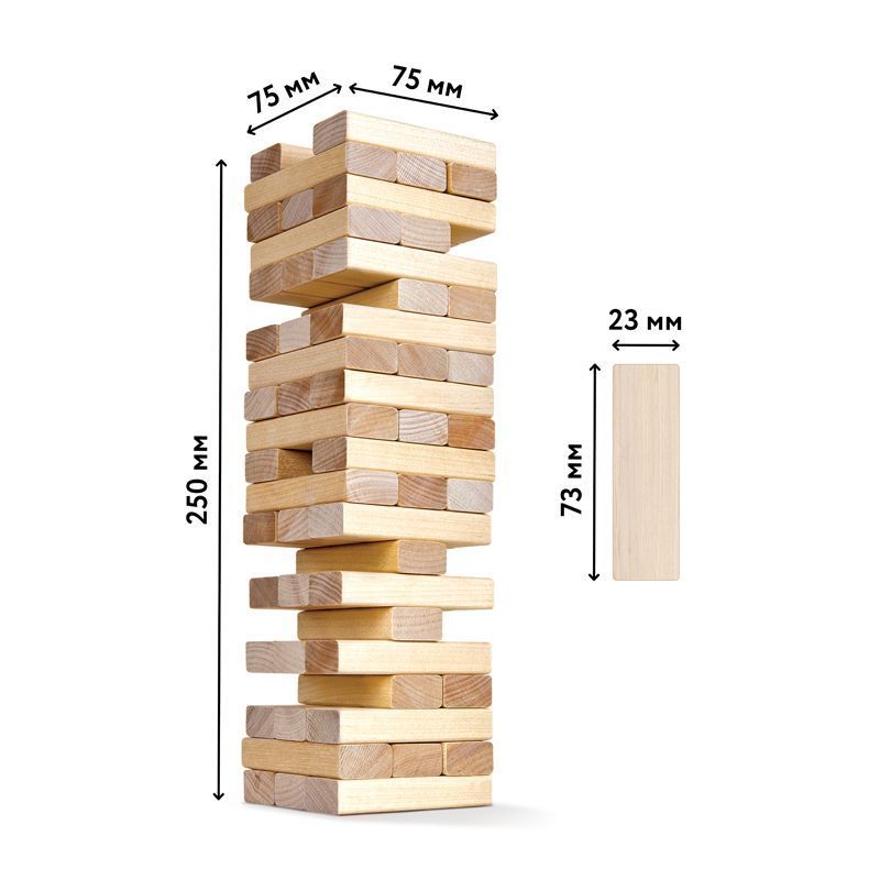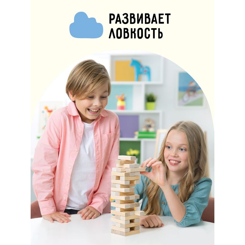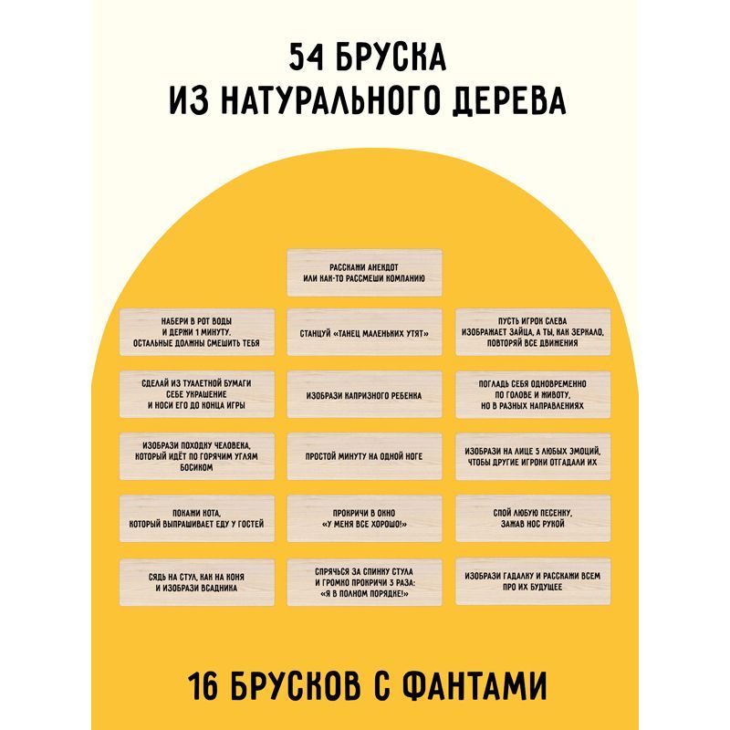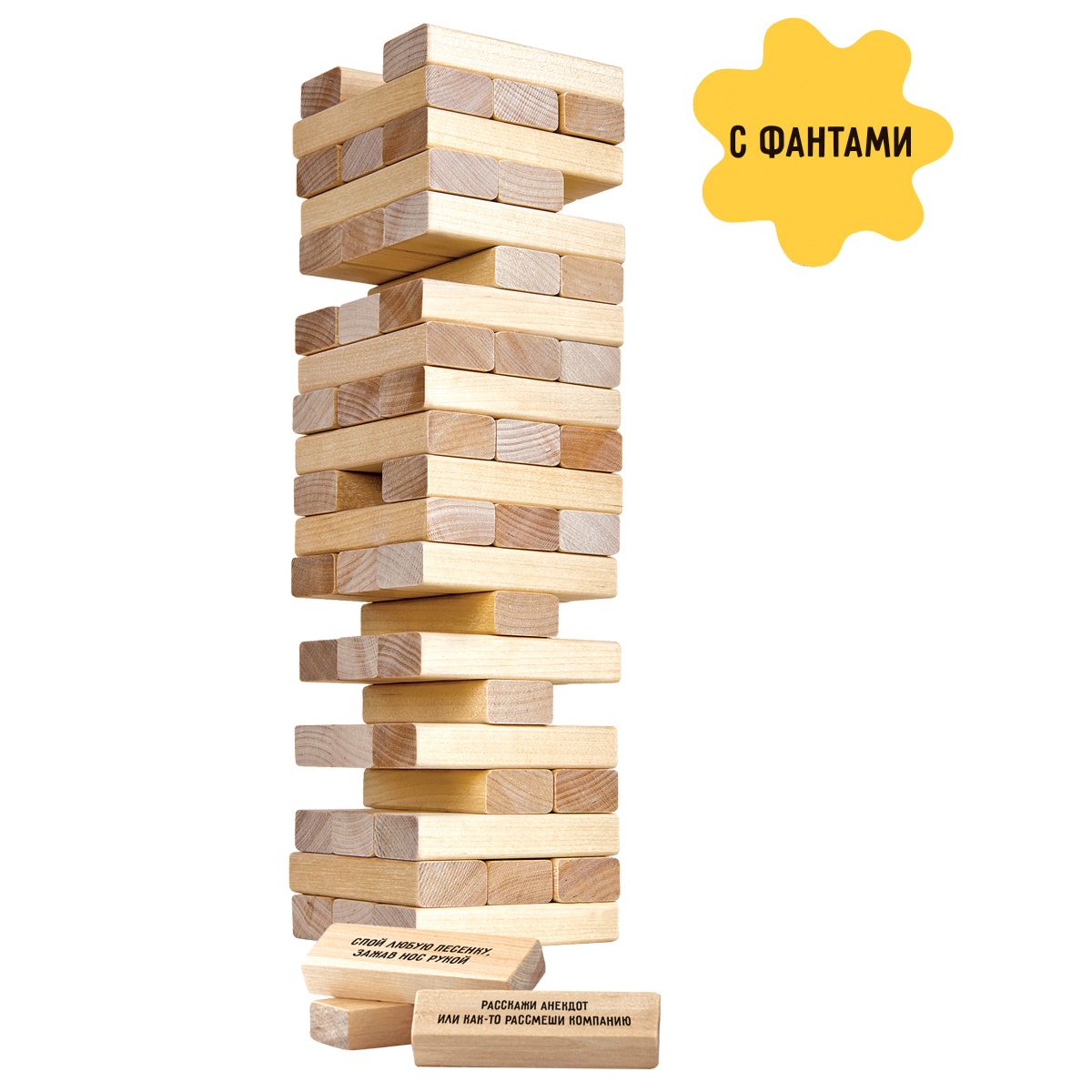 В комплект настольной игры для детей и взрослых ТРИ СОВЫ «Башня с фантами» входит специальный уголок для сборки башни и 54 бруска из натурального неокрашенного дерева из них 16 с фантами.